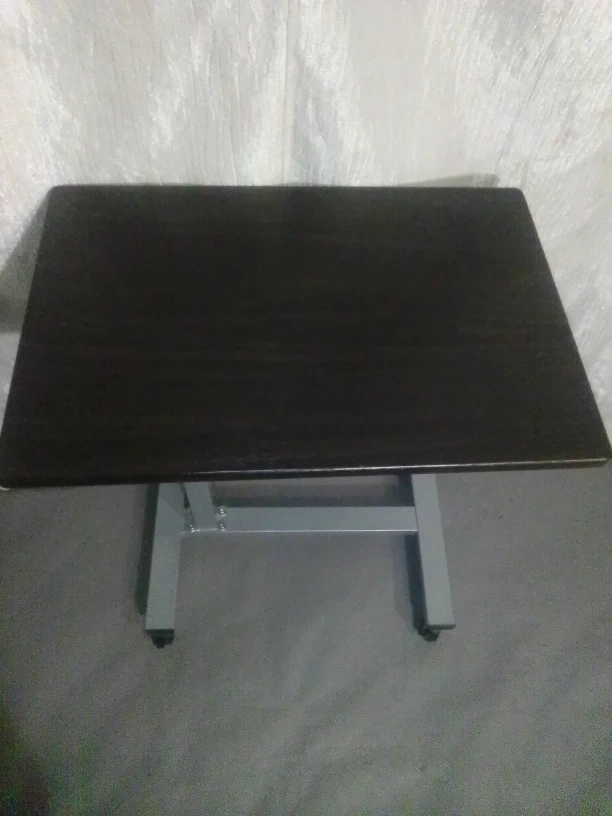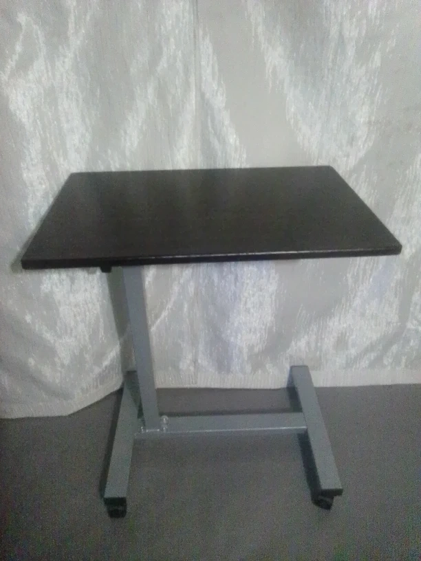 Selling an adjustable overbed table with a dark wood top and gray metal frame. It's in good condition and perfect for use in bed or with a chair. Great for reading, working, or eating