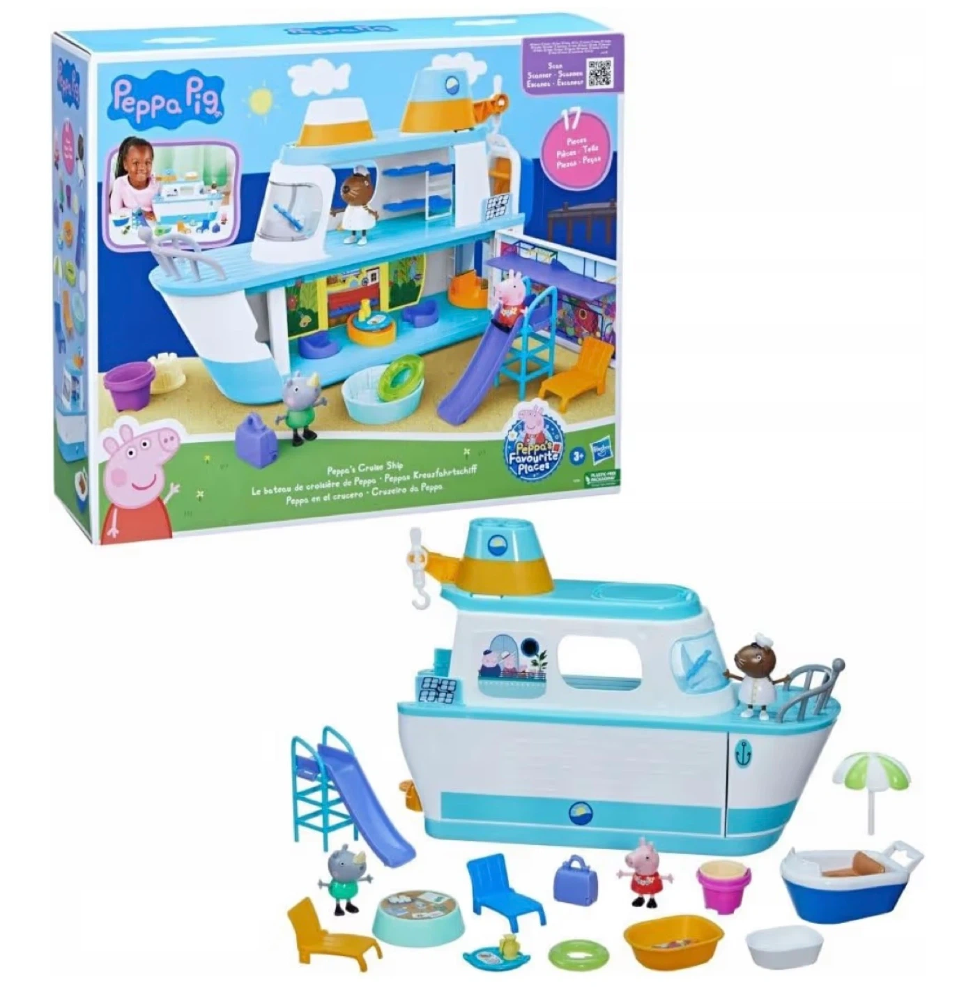 The Peppa Pig PEPPA'S CRUISE SHIP 17 Piece Playset by Hasbro includes 3 figures featuring the popular character, Peppa Pig. Made of plastic and in vibrant multicolor, this cruise ship playset is perfect for fans of the Peppa Pig TV show. The set comes boxed and ready for imaginative play, making it a fun and engaging toy for children ages 3 and up. The Peppa Pig Cruise Ship set is a must-have for any young fan of the cartoon and TV character franchise. Retails $59