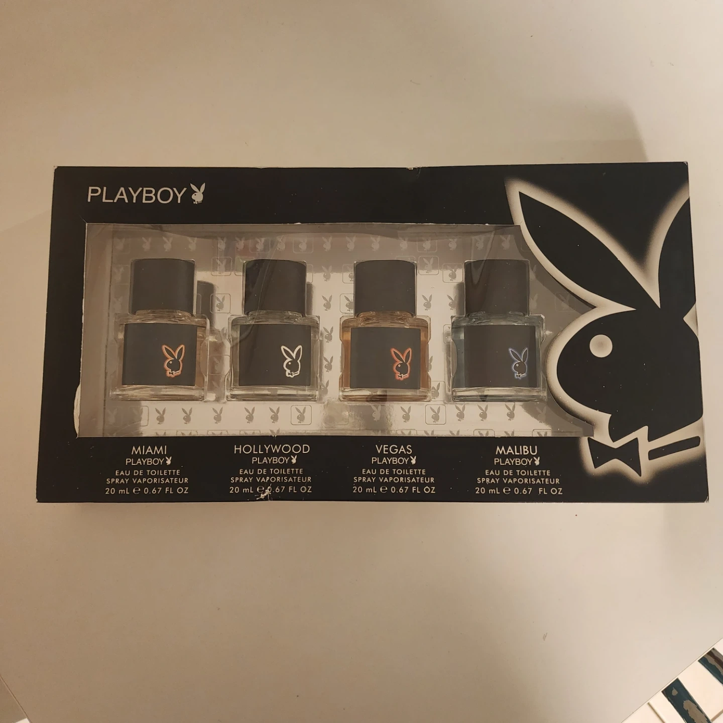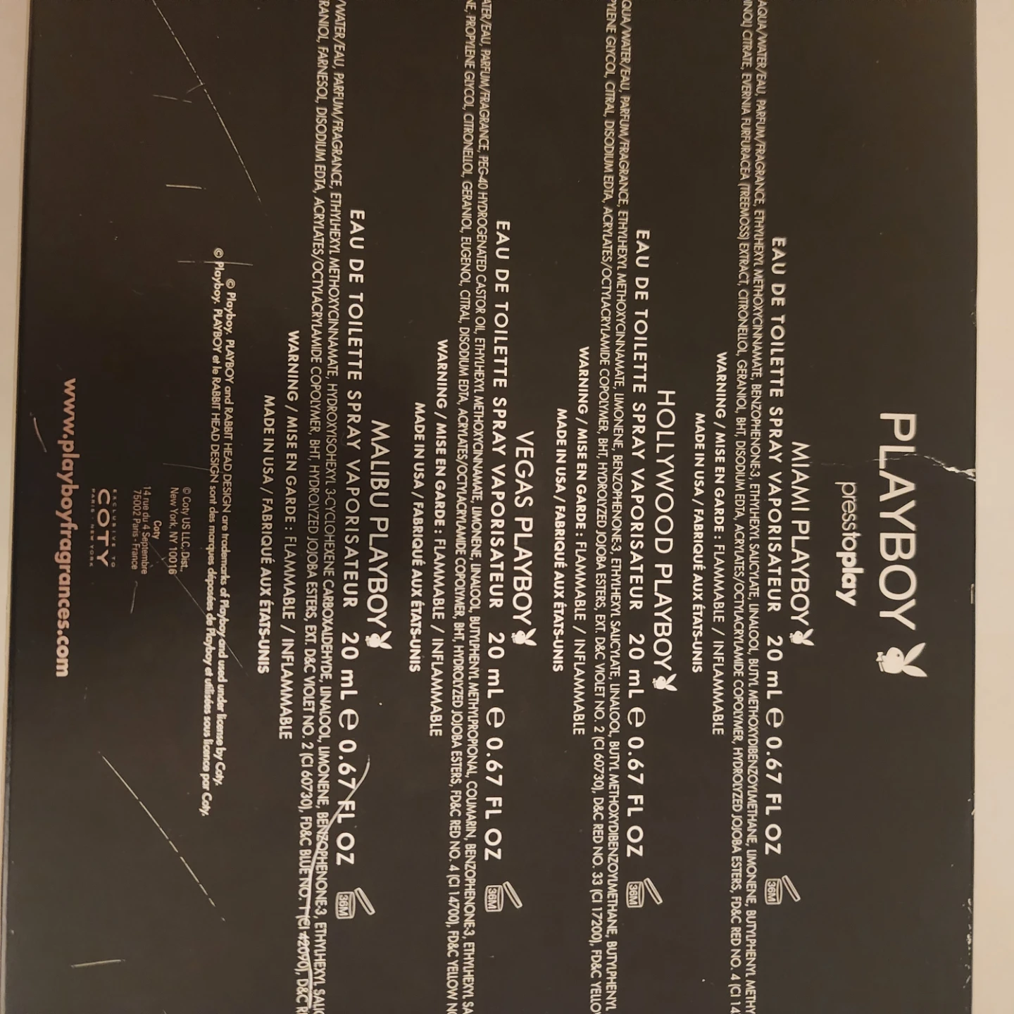 Selling a Playboy Press To Play mini cologne set! This set includes four different scents: Miami, Hollywood, Vegas, and Malibu. Each bottle contains 20 ml / 0.67 fl oz. Perfect for trying out different fragrances or for travel