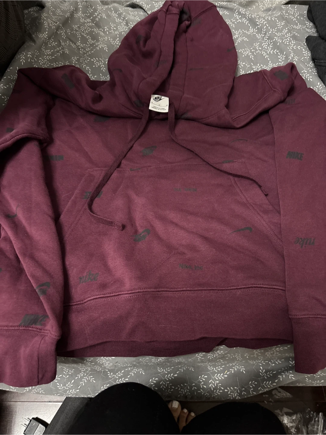 Selling a Nike hoodie with an all-over print design! It's a size medium and in great condition. The colour is a lovely burgundy. Perfect for staying cozy!
