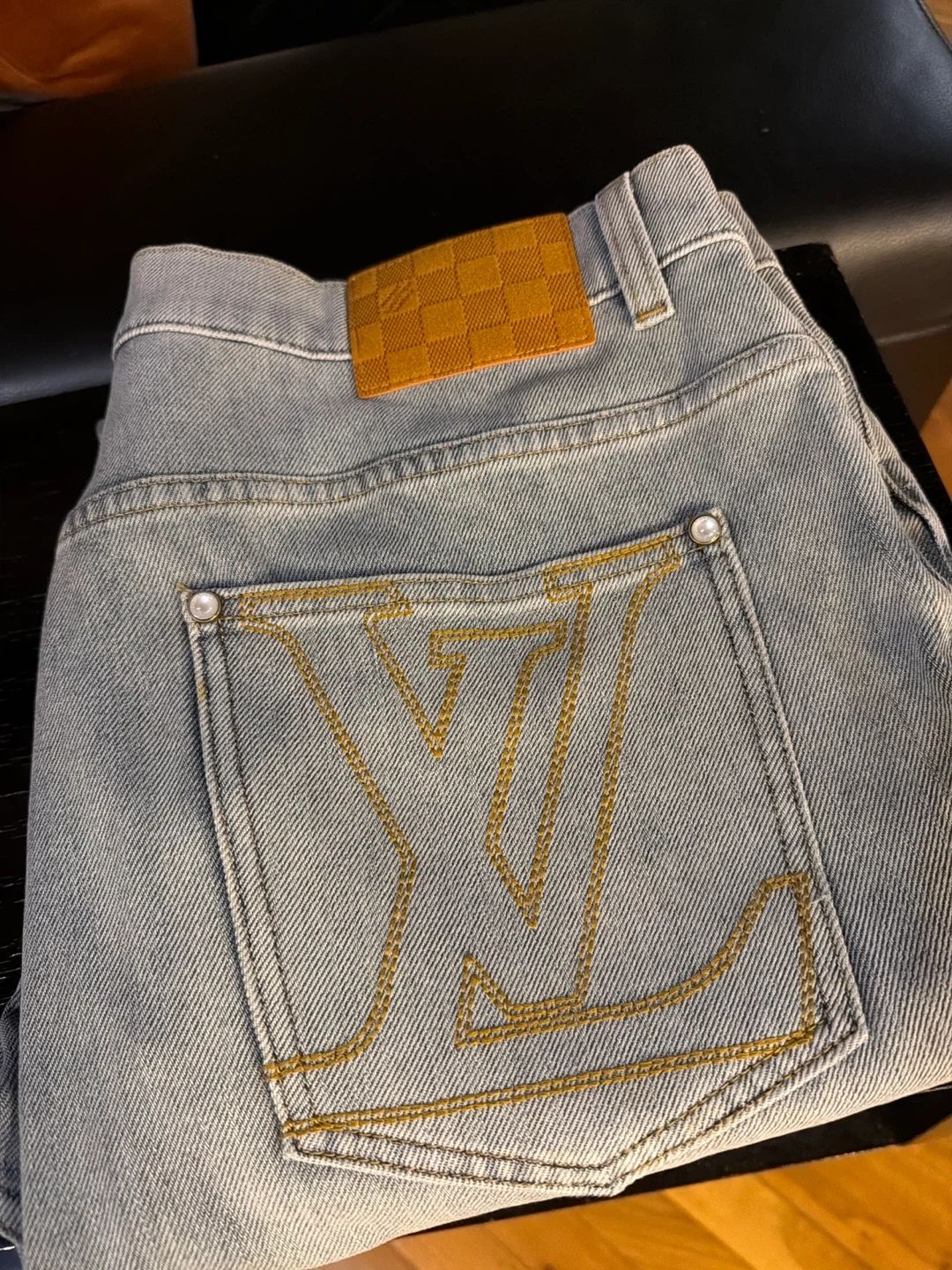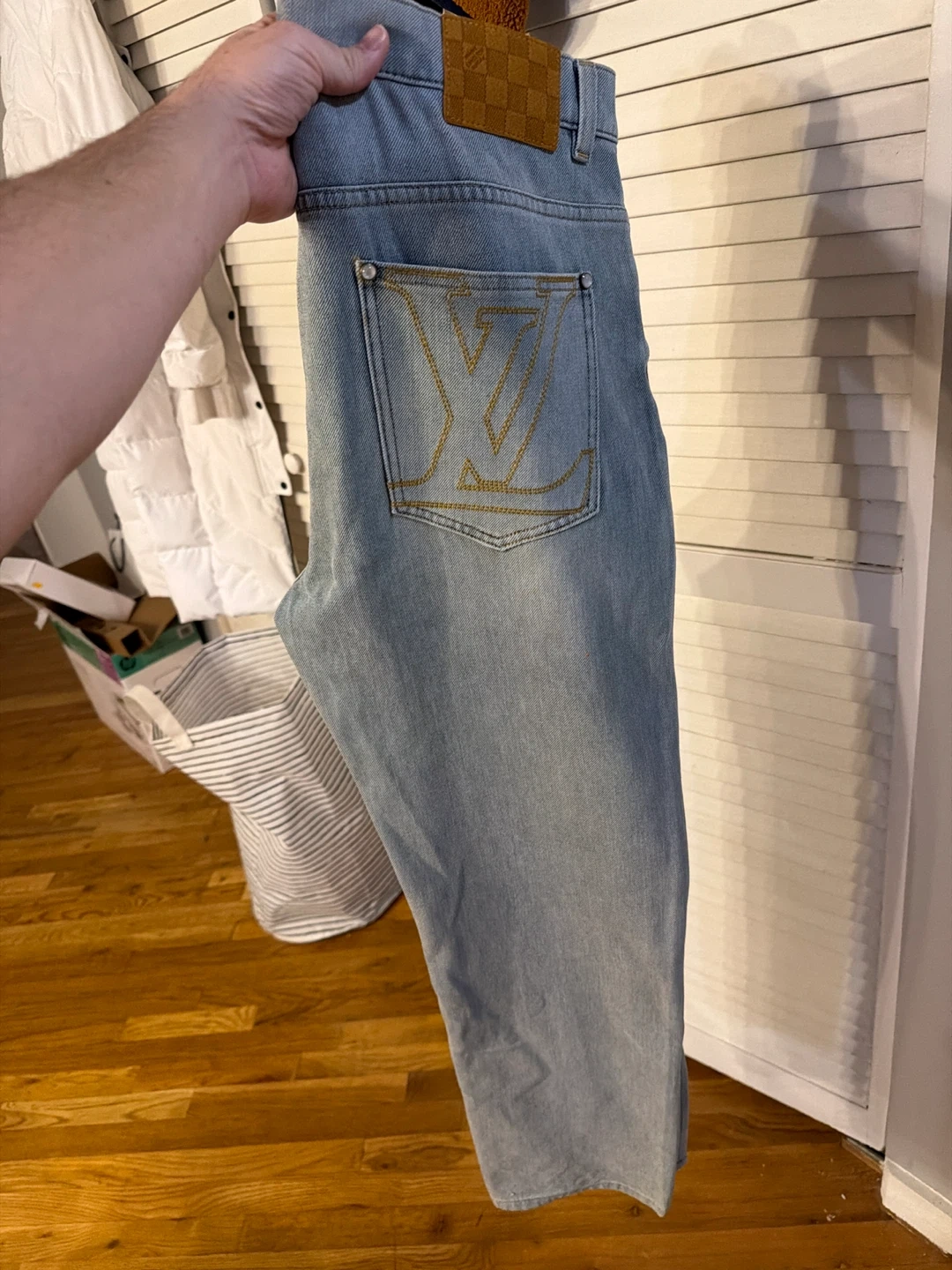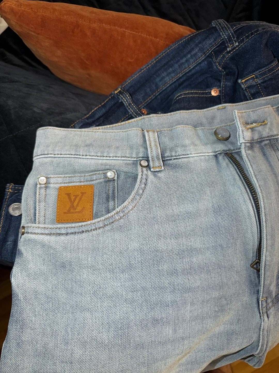 Selling a pair of Louis Vuitton light blue skate fit denim jeans. They feature the LV logo on the pocket and a leather patch on the back. I noticed a little detail on the LV stitching on back pocket but really on y’all to decide. Price firm.