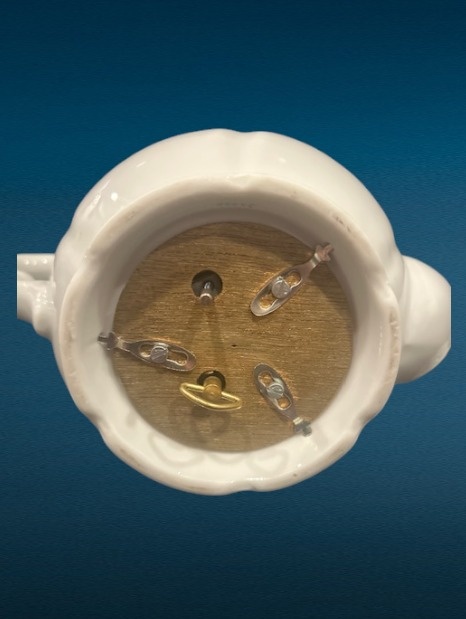 Teapot music box, crafted in Japan. This elegant piece features a wind-up mechanism on the base & plays a sweet melody (works perfectly) Approx. 5" H $50