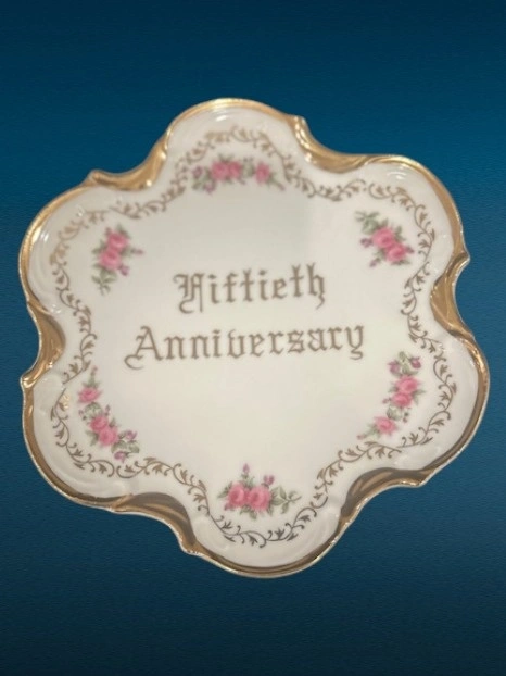 50th Golden Anniversary Plate - bone china, made in Japan. A vintage commemorative plate celebrating a 50th wedding anniversary (Golden Anniversary). Approx. 7.5" W x 8.25" H $25