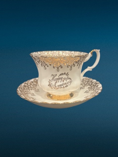 Royal Albert Happy Anniversary Teacup and Saucer Plate approx. 5.5" diameter Teacup approx. 3.5" rim diameter, 3" H $40