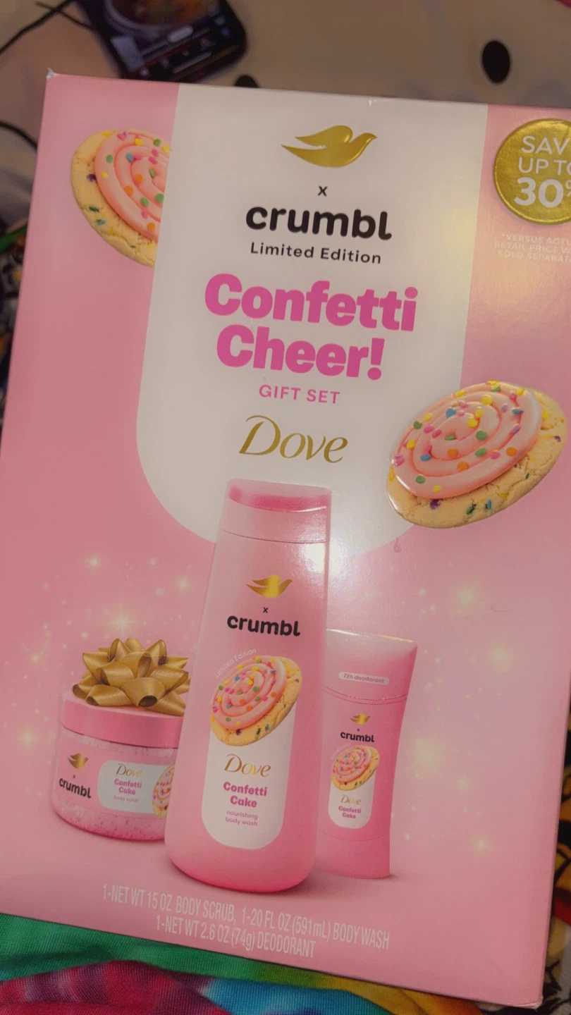 Selling a Dove x Crumbl Limited Edition Confetti Cheer! gift set. This set includes a 15 oz body scrub, a 20 fl oz body wash, and a 2.6 oz deodorant. Perfect for a little self-care or a sweet gift!