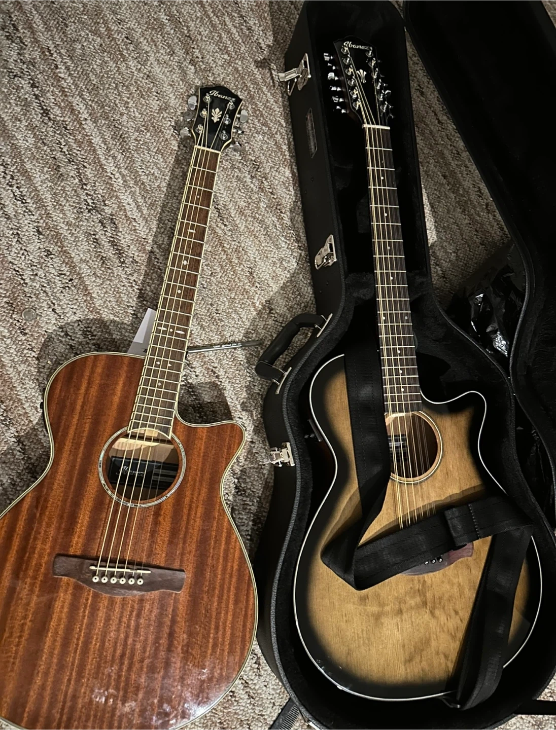 Selling two Ibanez acoustic guitars. One is a standard 6-string, and the other is a 12-string model. Both are in good condition and ready to play! 400$ for both