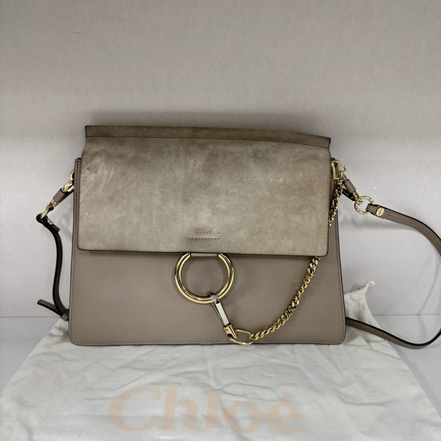 Selling a Chloé Faye shoulder bag. It's in great condition and ready for a new owner! The bag features a distinctive ring detail and a mix of leather and suede materials. It's a stylish and practical accessory to elevate your look