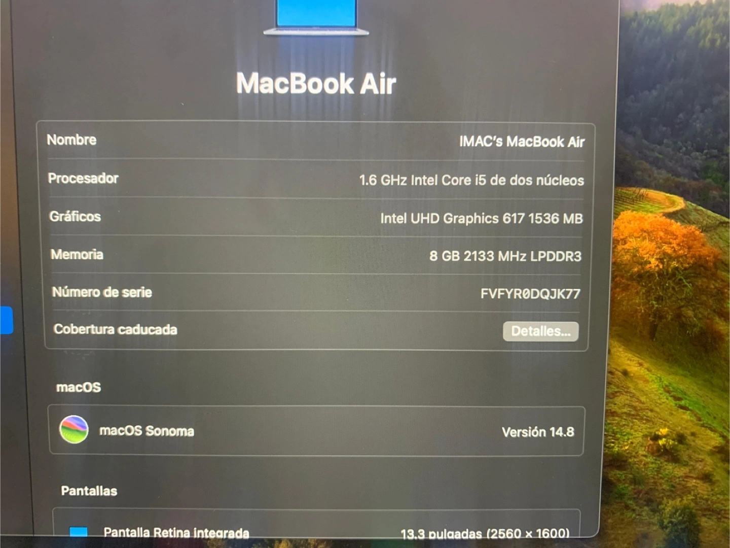 Selling a MacBook Air with a 13.3-inch Retina display. It has an Intel Core i5 processor, 8GB of memory, and Intel UHD Graphics 617 1536 MB. It's running macOS Sonoma version 14.8.