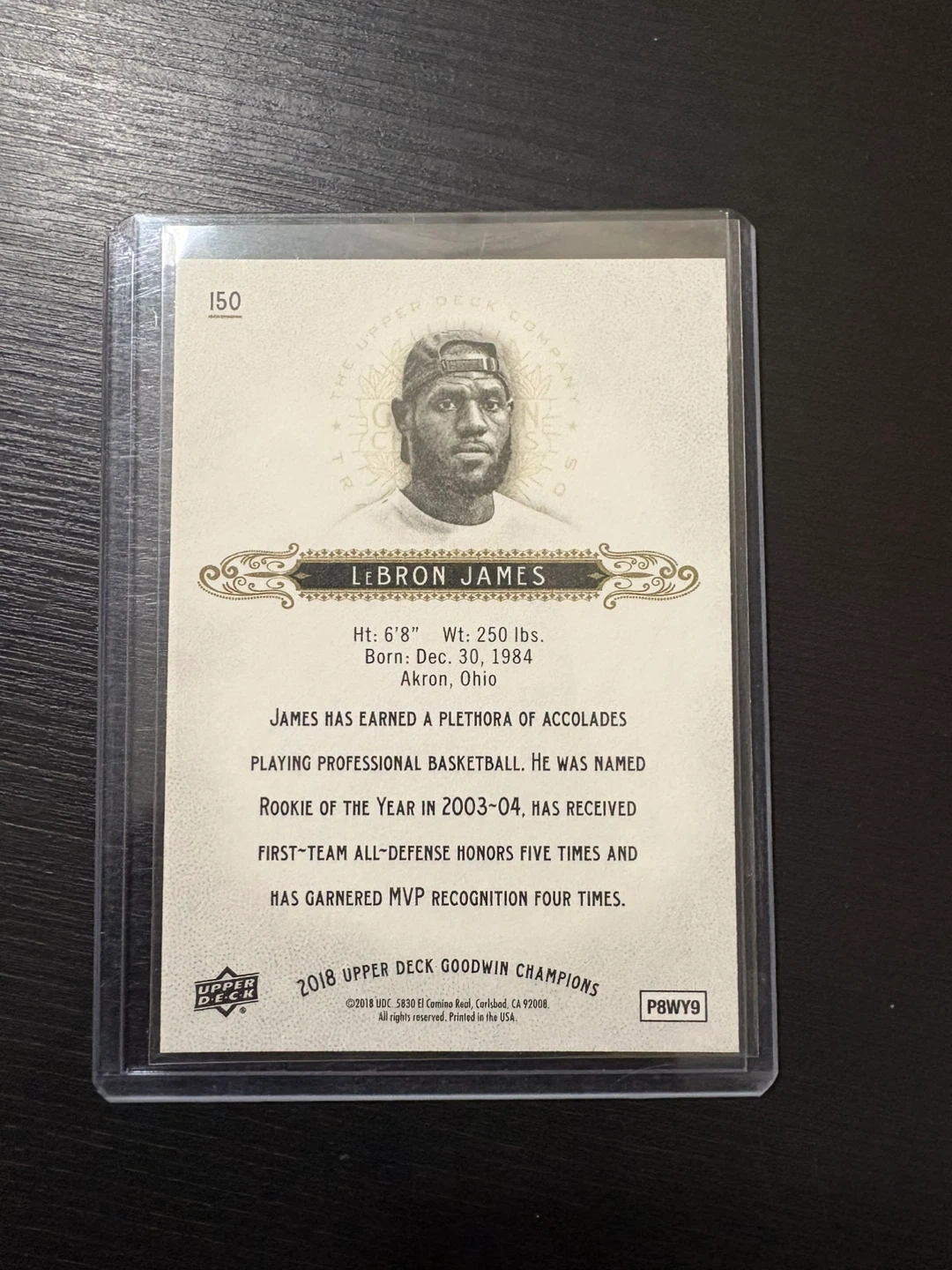 Selling a LeBron James 2018 Upper Deck Goodwin Champions trading card. It features a portrait of LeBron James. The card notes his height as 6'8" and weight as 250 lbs. It also mentions he was named Rookie of the Year in 2003-04 and has received First-Team All-Defense honors five times, and has garnered MVP recognition four times
