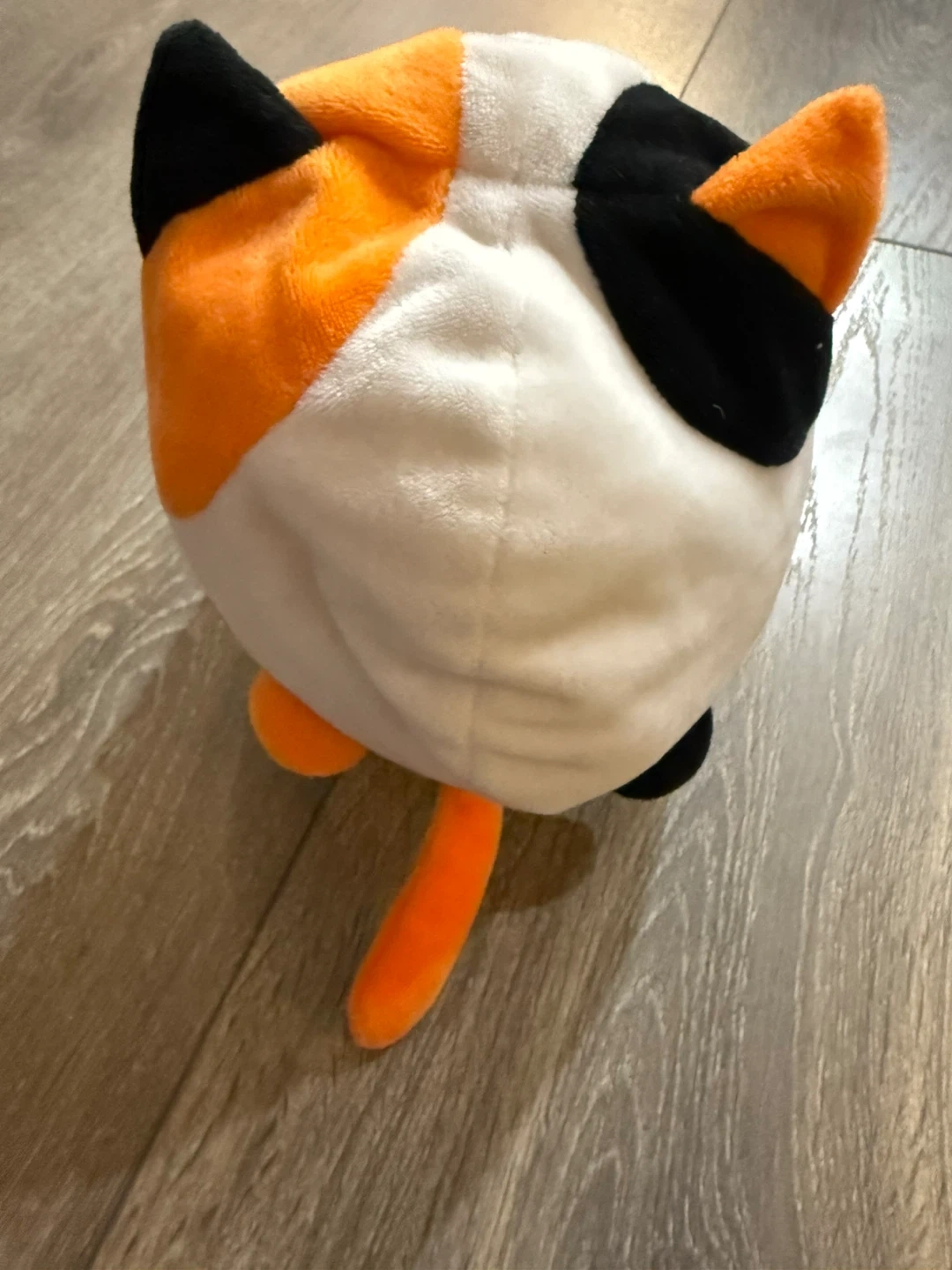 Selling a cute cat plushie! It's in great condition and features a unique design with white, orange, and black colours. It's about 7 inches tall.