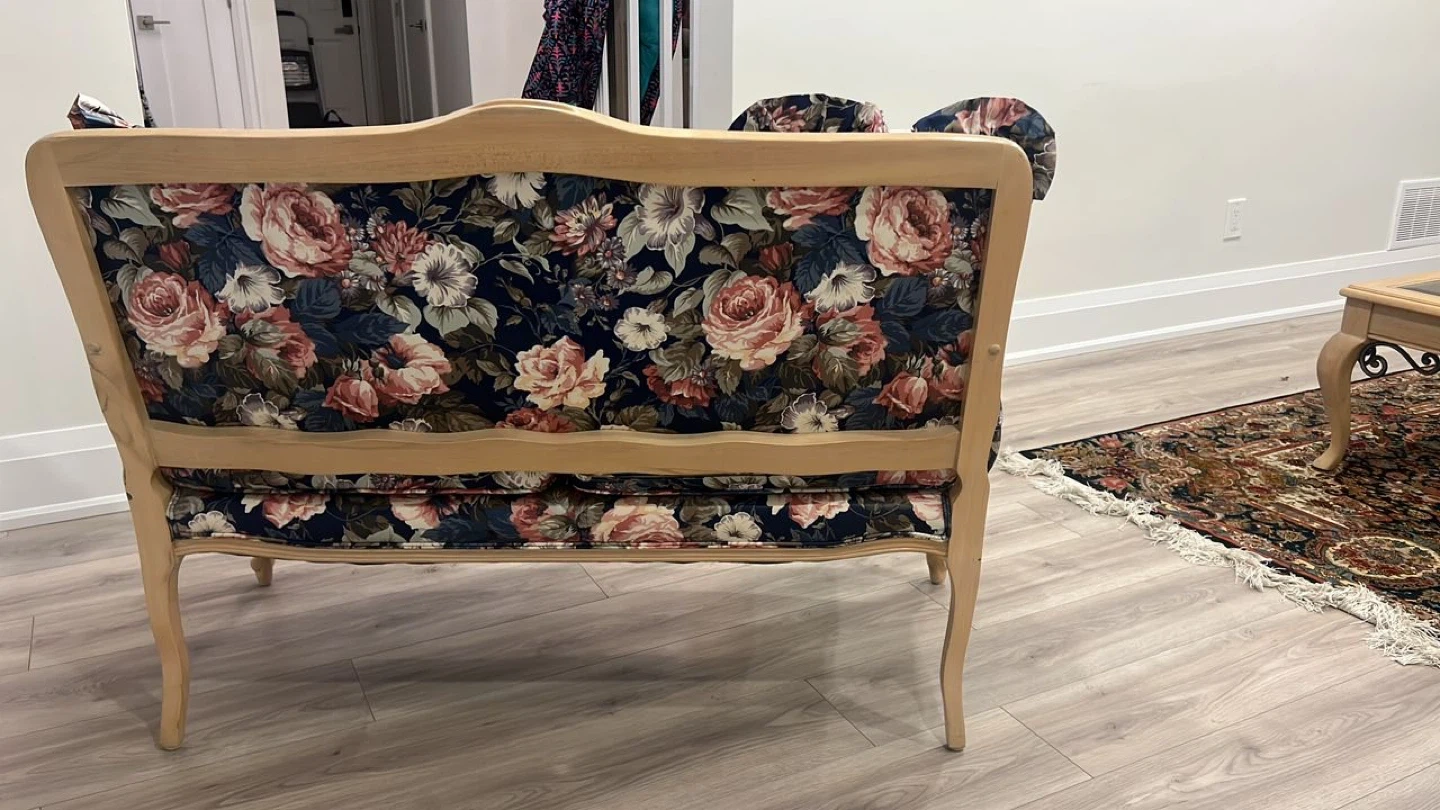 Selling a beautiful floral loveseat that would look great in any home! It comes with matching floral pillows to complete the look. The loveseat is in great condition and ready for a new home. The floral design features a mix of pink, white, and navy blue flowers on a dark background. A stylish and comfy addition to your living space!