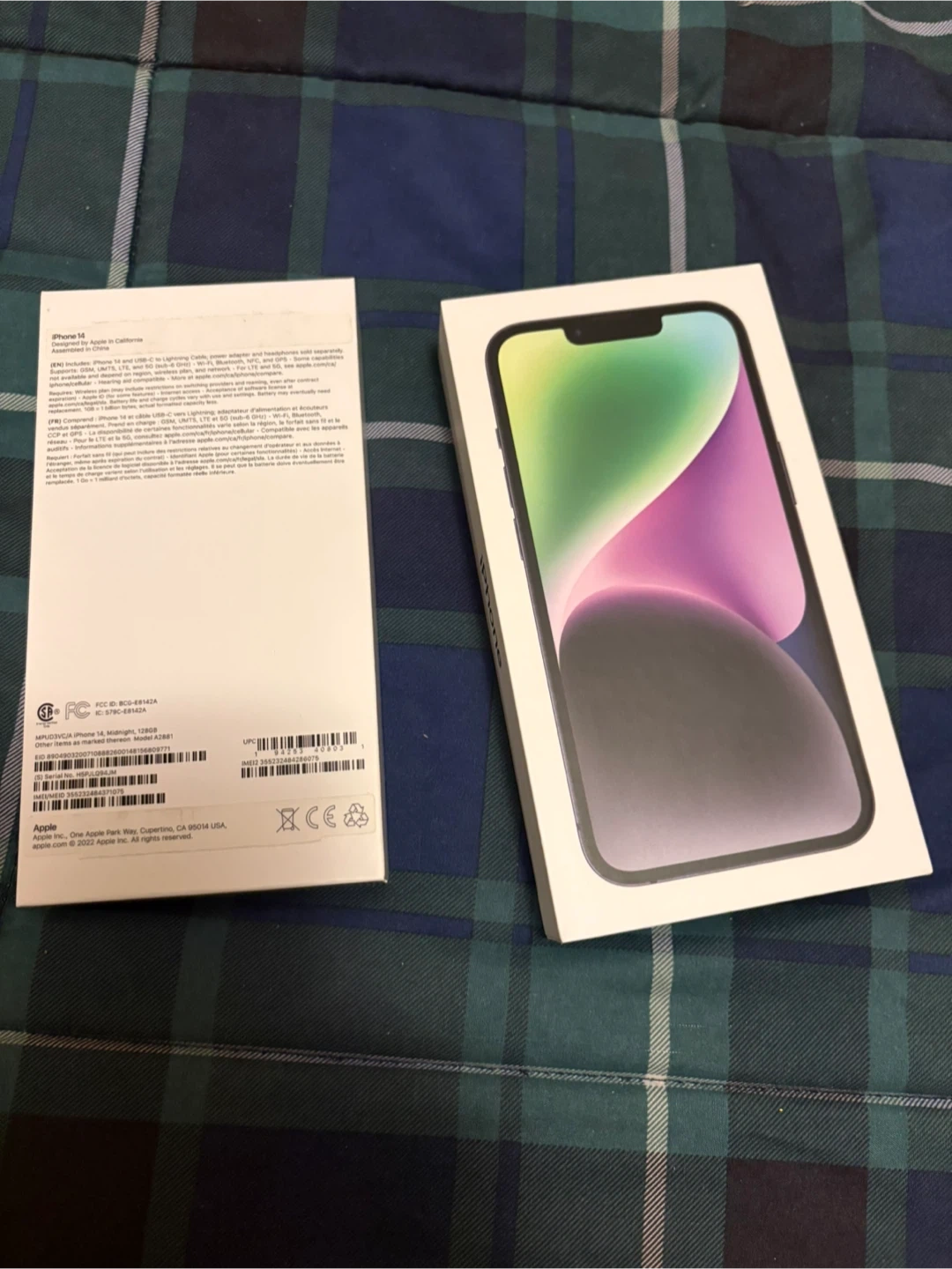 Selling an iPhone 14 in Midnight with 128GB of storage. It comes with its original box and charging cable. Also included is a Drop brand phone case for extra protection!