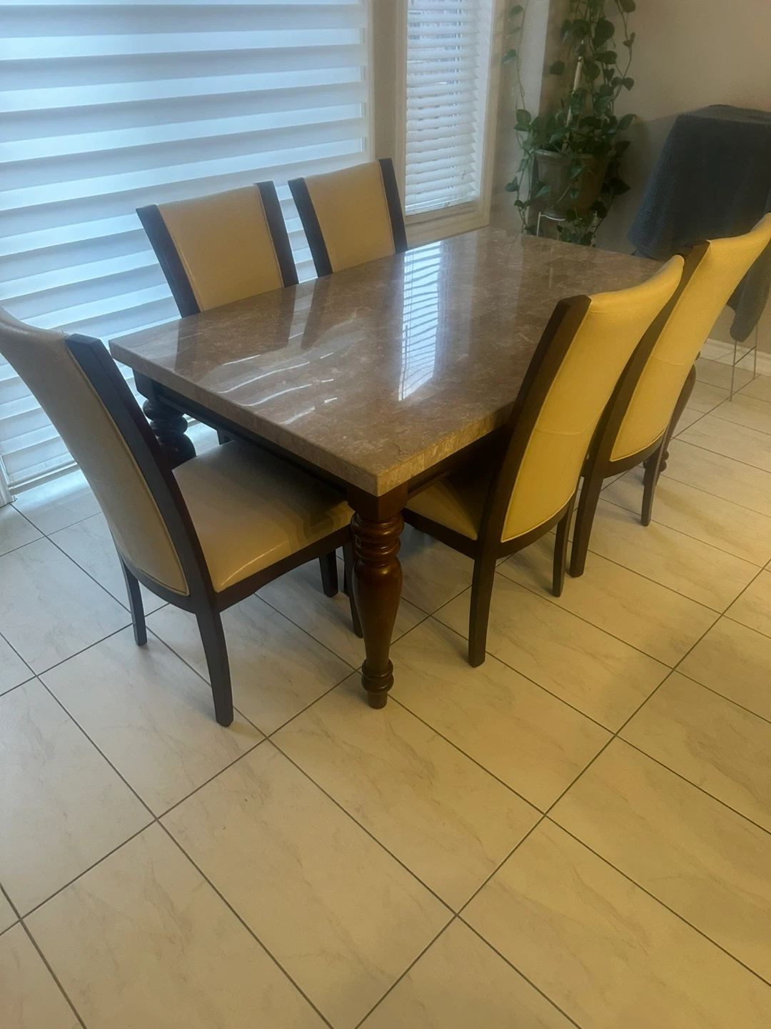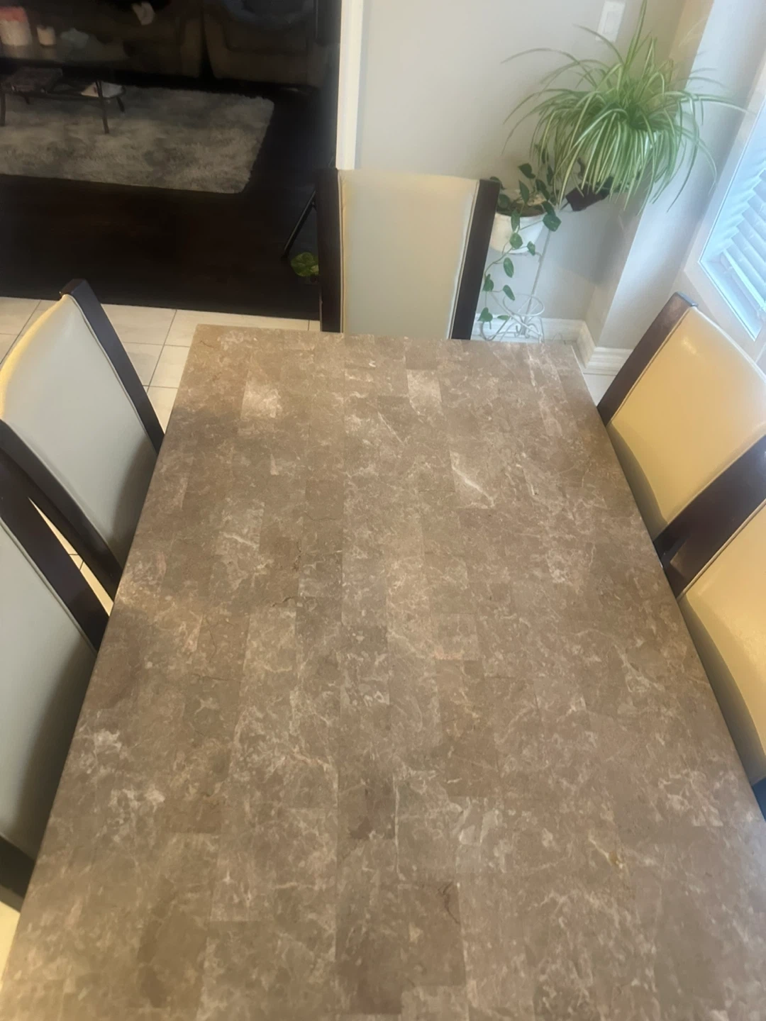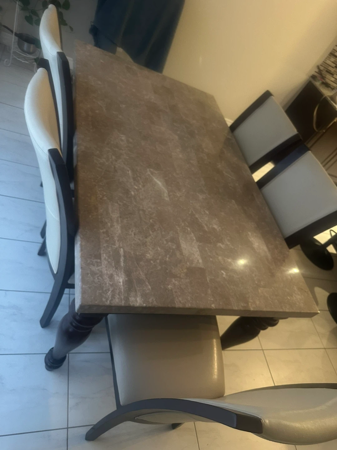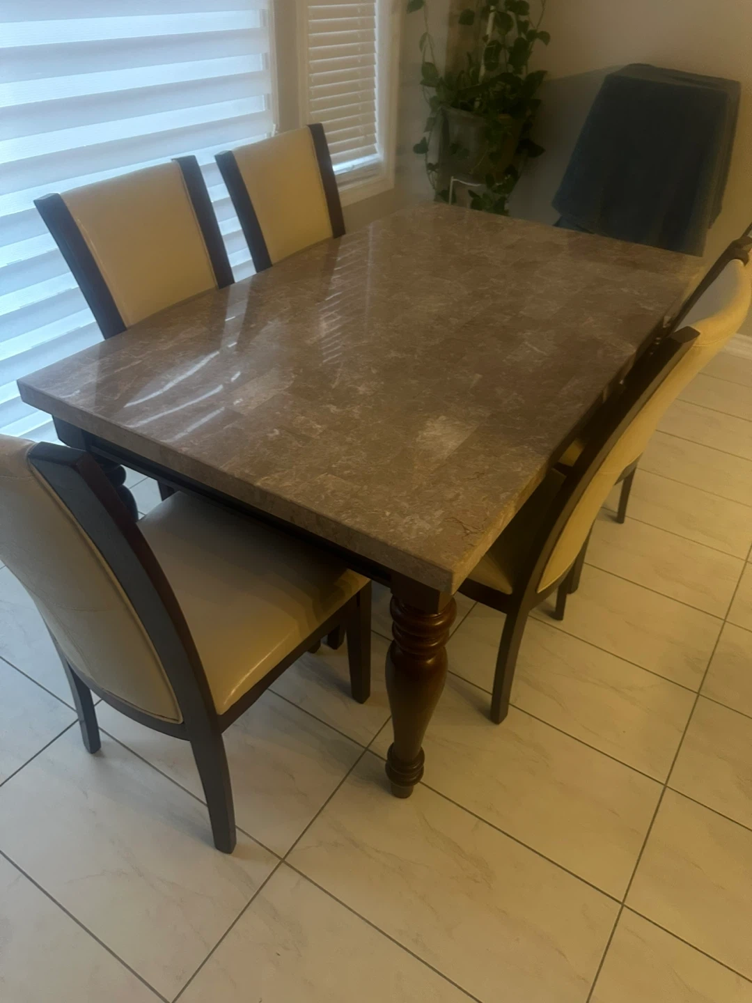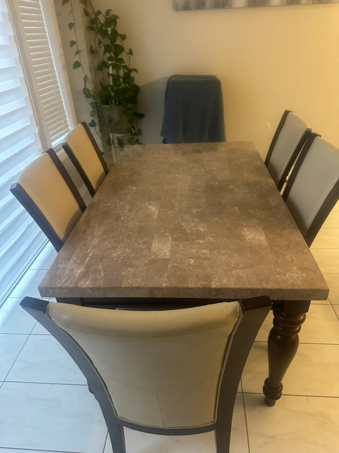 Selling a dining table set that includes the table and five chairs. The table has a faux marble top and dark wood legs. The chairs have a beige leather seat and dark wood frame. It's a great set for family dinners. 163cm (64 inches) long and 97cm (38 inches) wide. Can negotiate