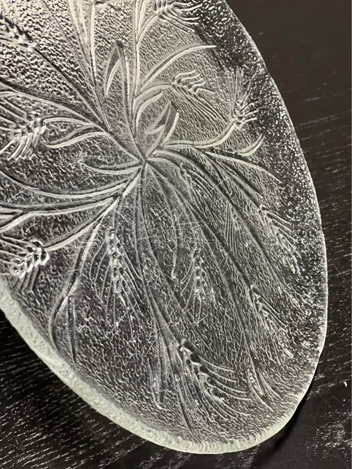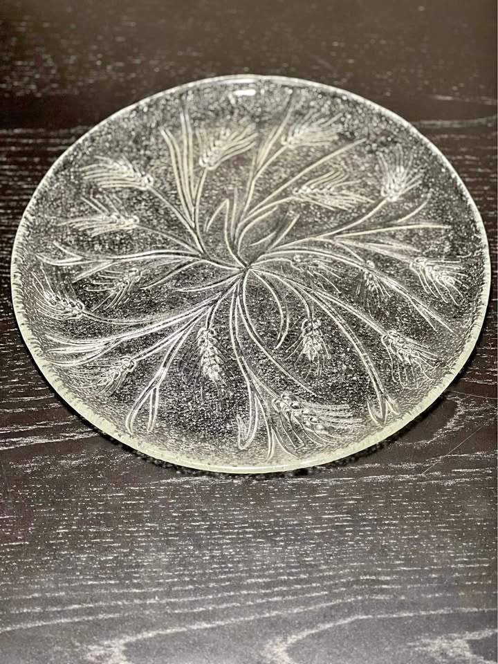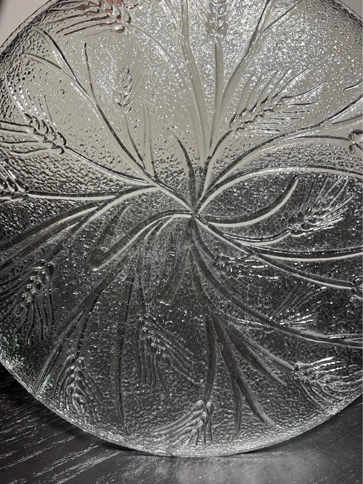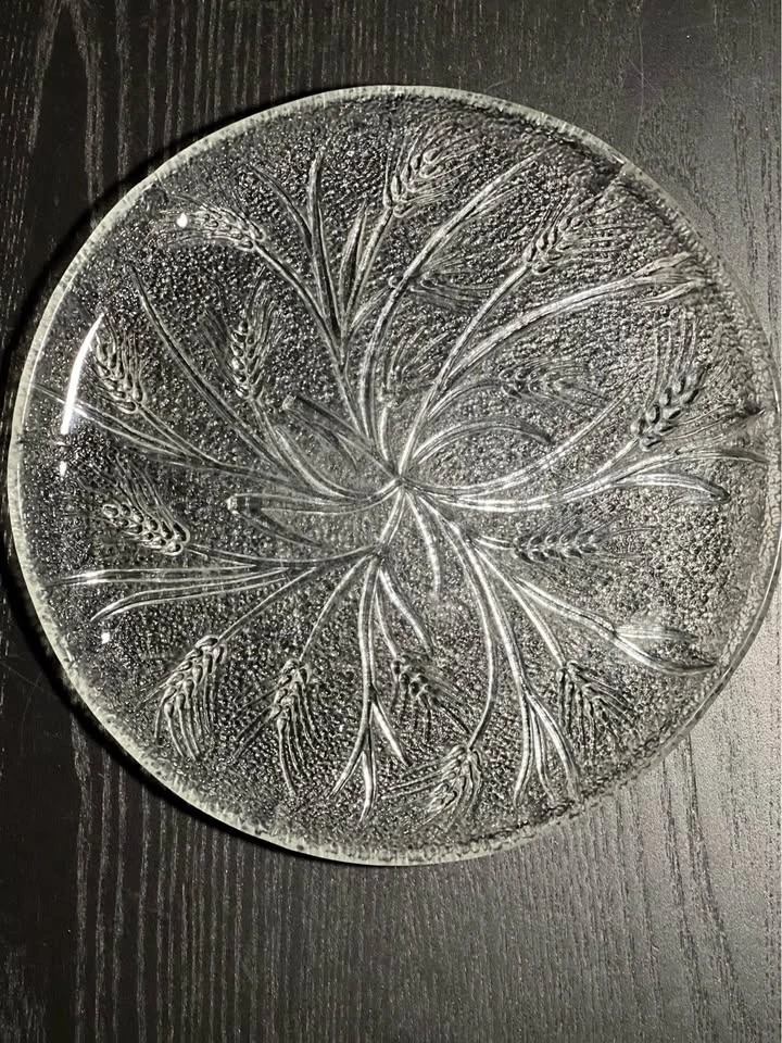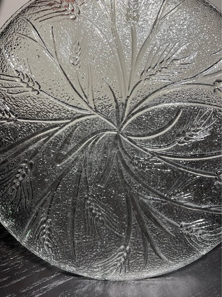 The glass dish is likely a piece from the Arcoroc "Country Wheat" pattern. This pattern features a detailed, clear glass design of wheat stalks that was popular in the 1970s and 80s. Other companies, such as Federal Glass and Anchor Hocking, also produced similar wheat-patterned glassware.