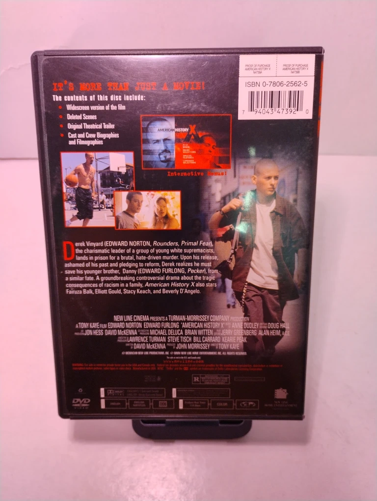 Selling a used DVD of American History X. The contents of the disc include: widescreen version of the film, deleted scenes, original theatrical trailer, and cast and crew biographies and filmographies. It's more than just a movie! Disc is super clean
