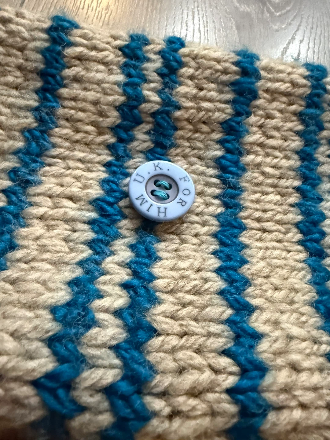 Selling a cozy, handmade knitted scarf with a unique striped pattern in blue and beige! It features a cute button detail. Perfect for adding a touch of warmth and style to your winter outfits