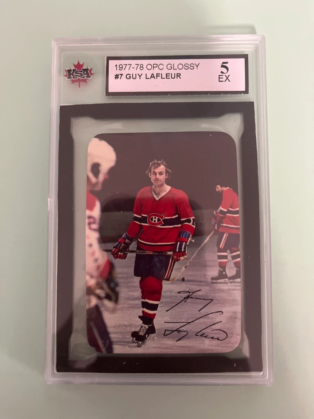 Selling a 1977-78 O-Pee-Chee (OPC) Glossy hockey card featuring Guy Lafleur of the Montreal Canadiens. This card is graded EX (5). It's card number 7 of 22.