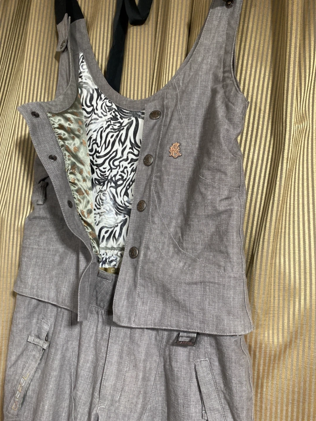 Selling a Caprice ski suit set in size small. It's a stylish two-piece set, perfect for hitting the slopes! The material is breathable and waterproof, rated at 15K/10K mm. The lining features a cool zebra print. Machine washable for easy care