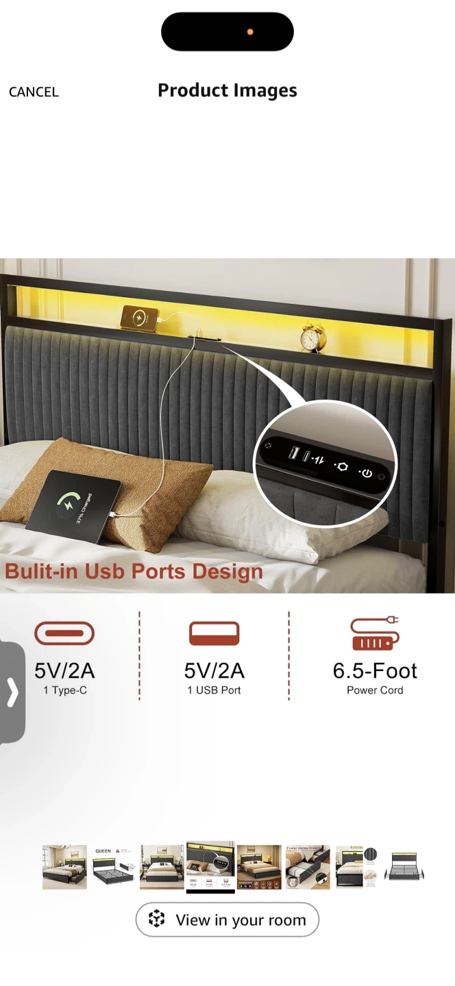 Selling a Queen size bed frame in dark grey. It features a built-in USB port design with 5V/2A 1 Type-C and 5V/2A 1 USB Port. The headboard has LED lights. It also has drawers for storage. The bed frame is made with high quality velvet fabrics and high density sponge filling.