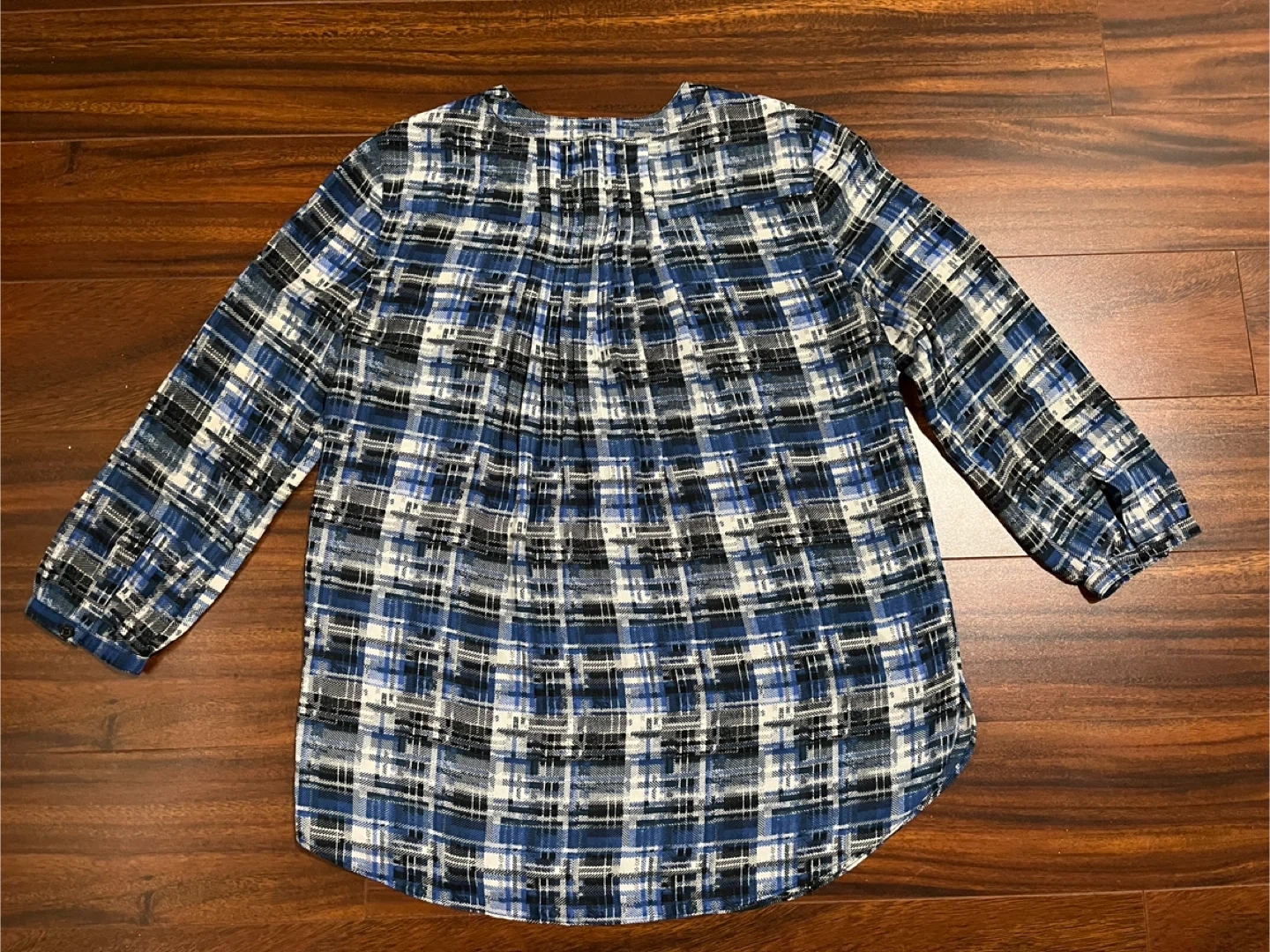 Like new NYDJ blouse in women’s extra small. Blue and white plaid print with pintuck pleats on the back. 3/4 sleeves and 5-button front. 100% polyester. Style # S01081F059. Smoke free home.