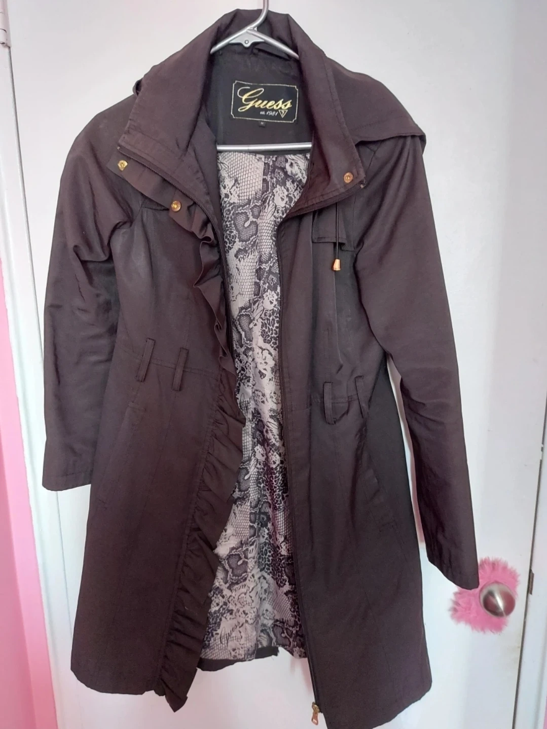 Selling a stylish Guess trench coat in a lovely grey colour! It's a size medium and features a unique snakeskin-patterned lining. Perfect for those cooler days!