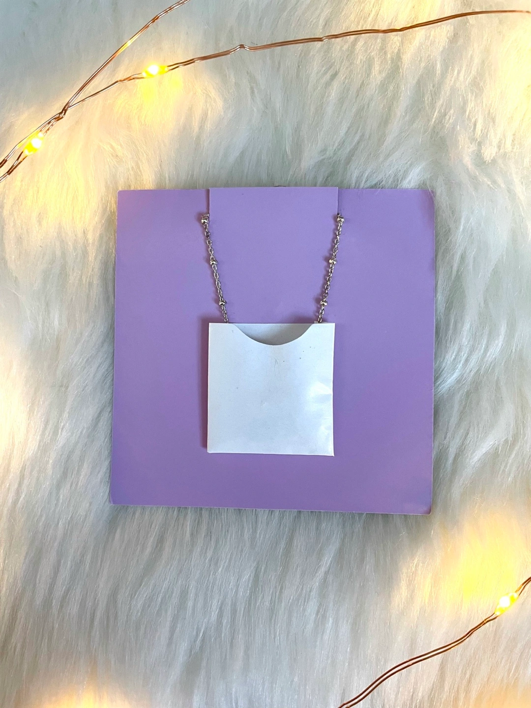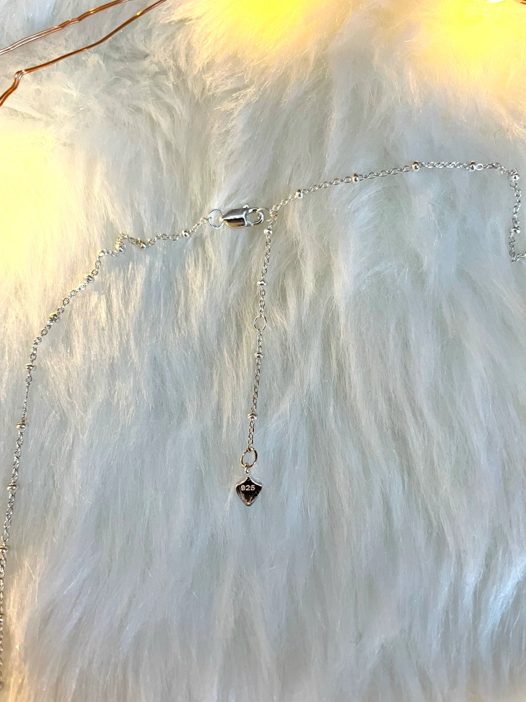 It has a beautiful chain with round balls along it. The backing is adjustable length. It was only taken out of packaging for pictures.