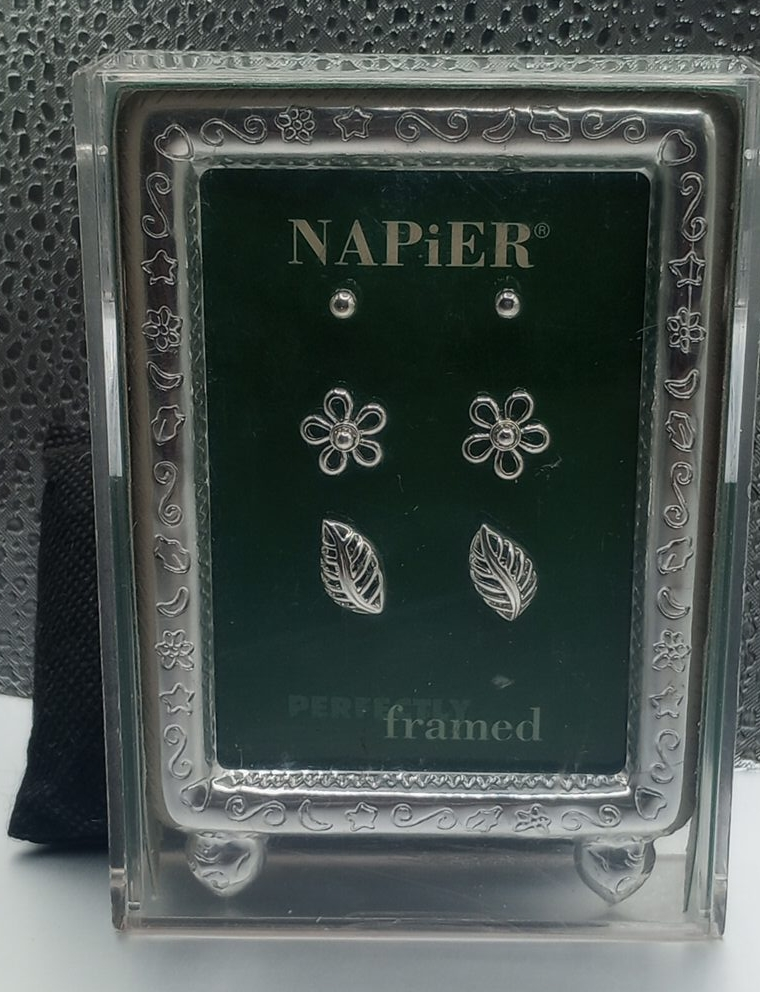 Selling a set of Napier silver-tone stud earrings, still in the original "Perfectly Framed" packaging! The set includes three pairs of earrings: simple studs, flower-shaped studs, and leaf-shaped studs