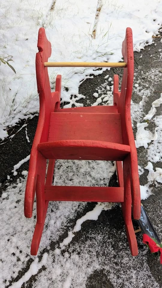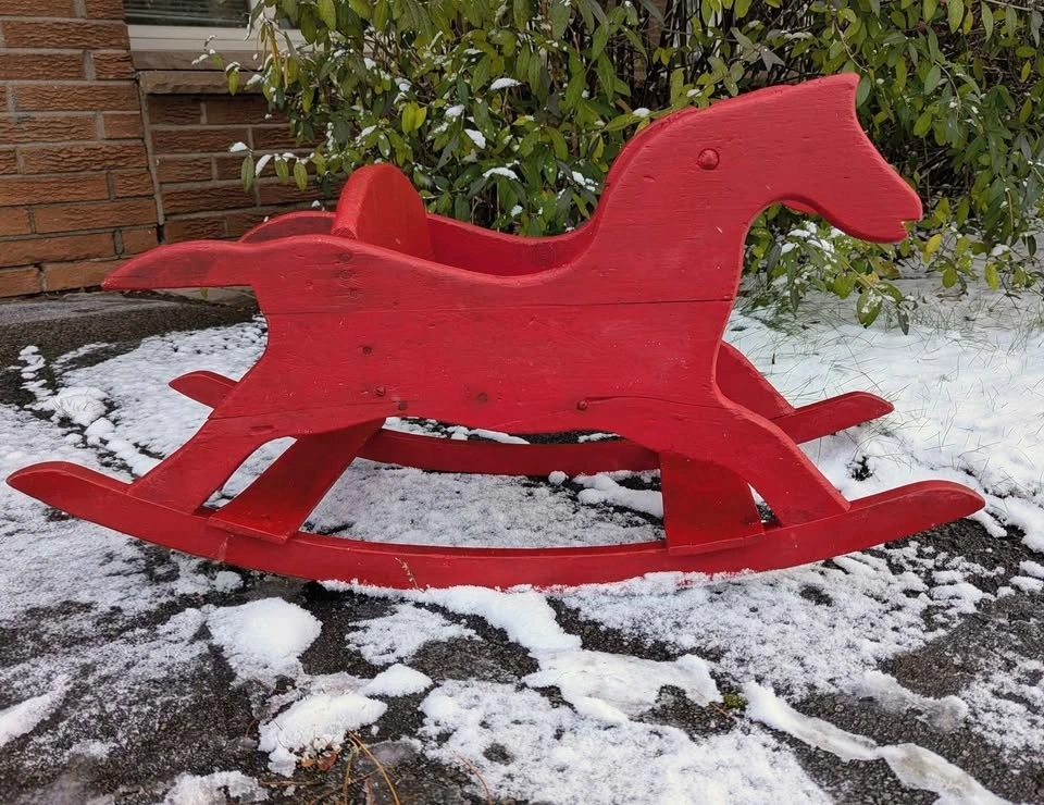 Charming old handmade wooden rocking horse, painted bright red! Classic folk-art silhouette with curved rockers and built-in seat. Sturdy seat and rocking. Approx. size: 32" L 12" W 16" H. Functional with some minor touch ups otherwise ready to go as rustic décor, photo prop or display piece. Likely early/mid-20th century. Sold as is.