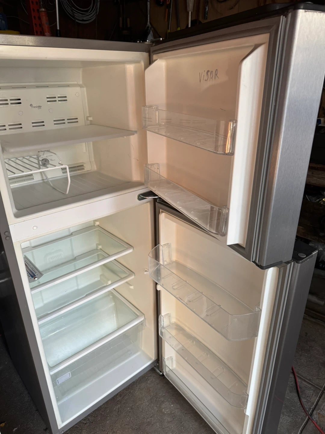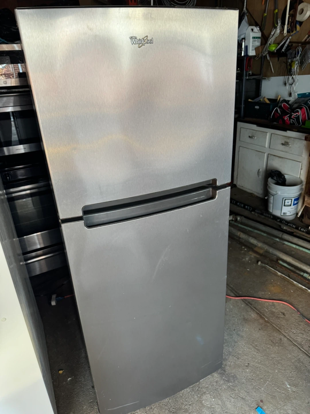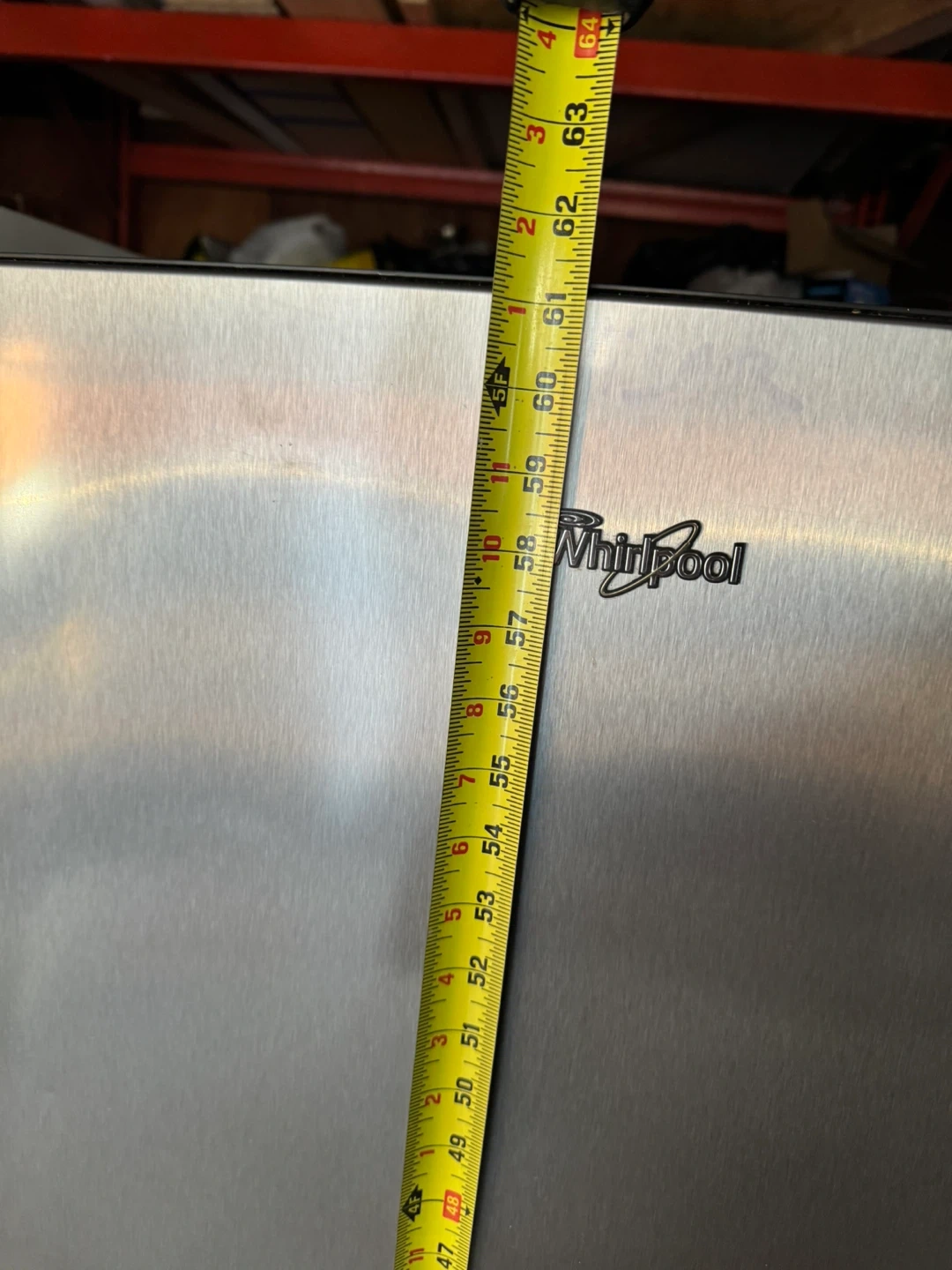 Selling a Whirlpool refrigerator in stainless steel! It's a top-freezer model. The fridge measures approximately 63 inches in height and 24 inches in width. It's in good working condition and ready to keep your food fresh