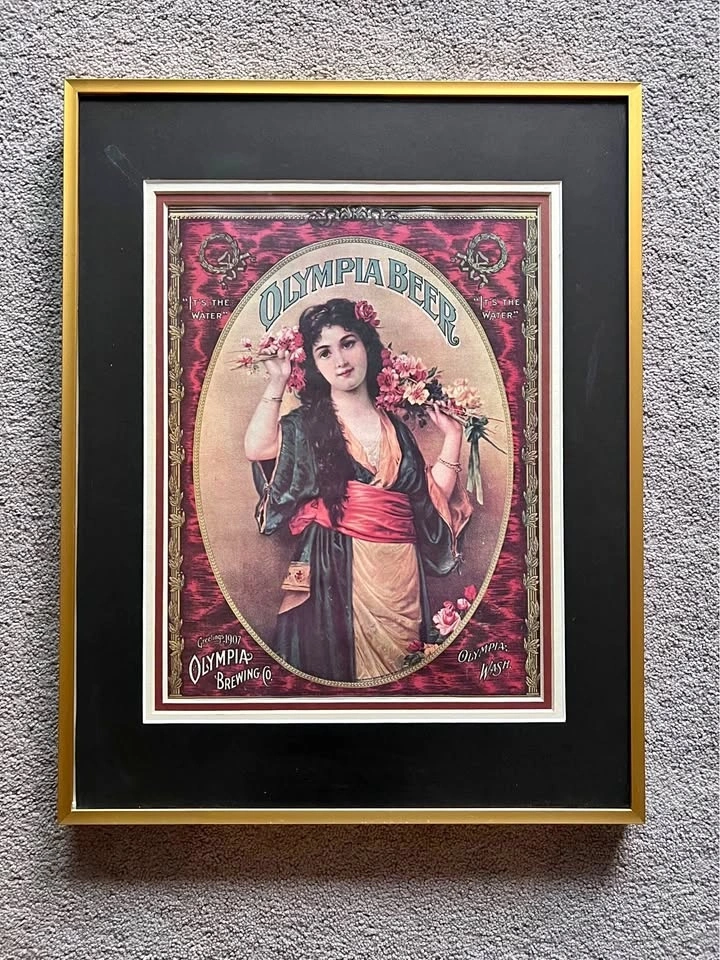 Beautifully framed authentic Olympia Beer advertisement poster! I’ve held onto this for a long time. Such a beautiful poster, sadly it’s time to let it go to a good home! For all beer lovers, vintage lovers, or anyone looking for a fun art piece.