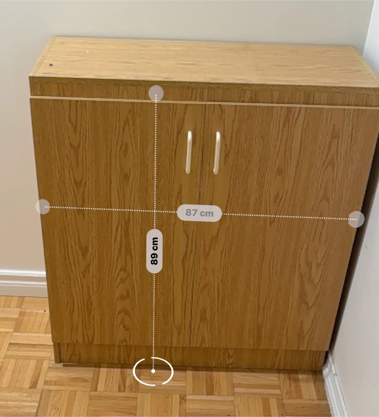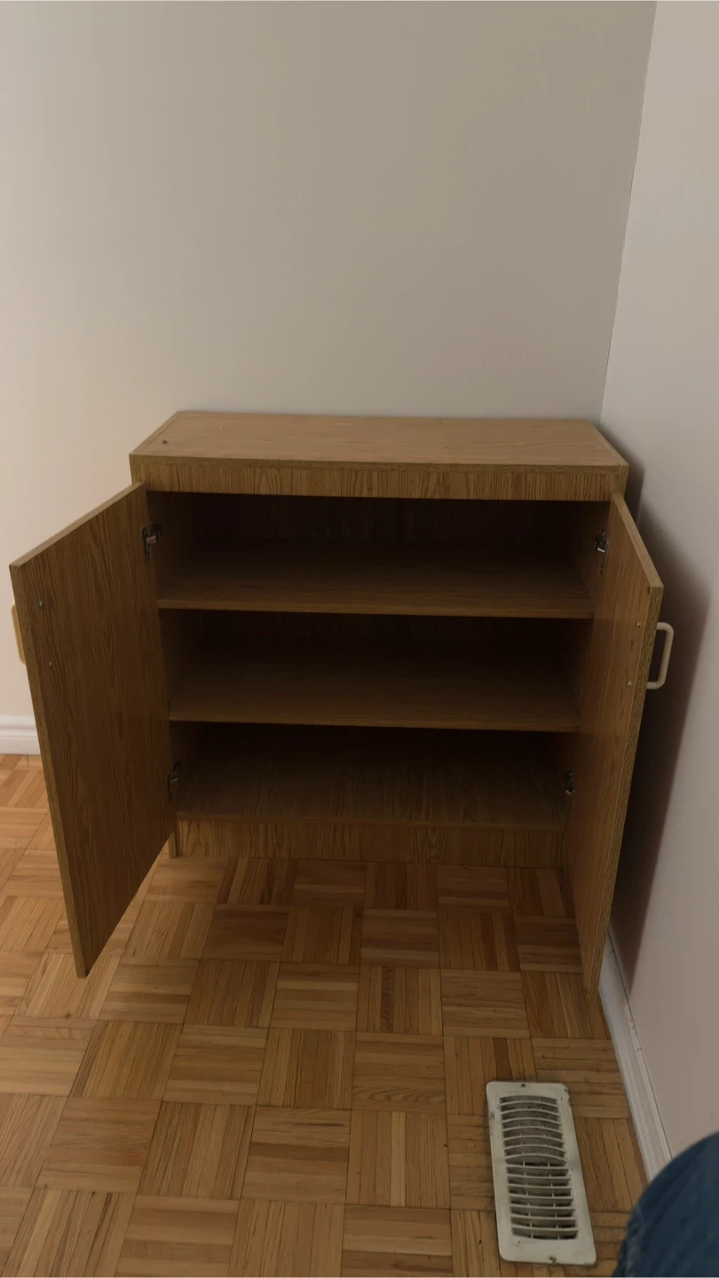 Selling a wooden cabinet in good condition. It has two shelves inside. It's perfect for extra storage space in any room of your home. Size of the wooden cabinet in third slide