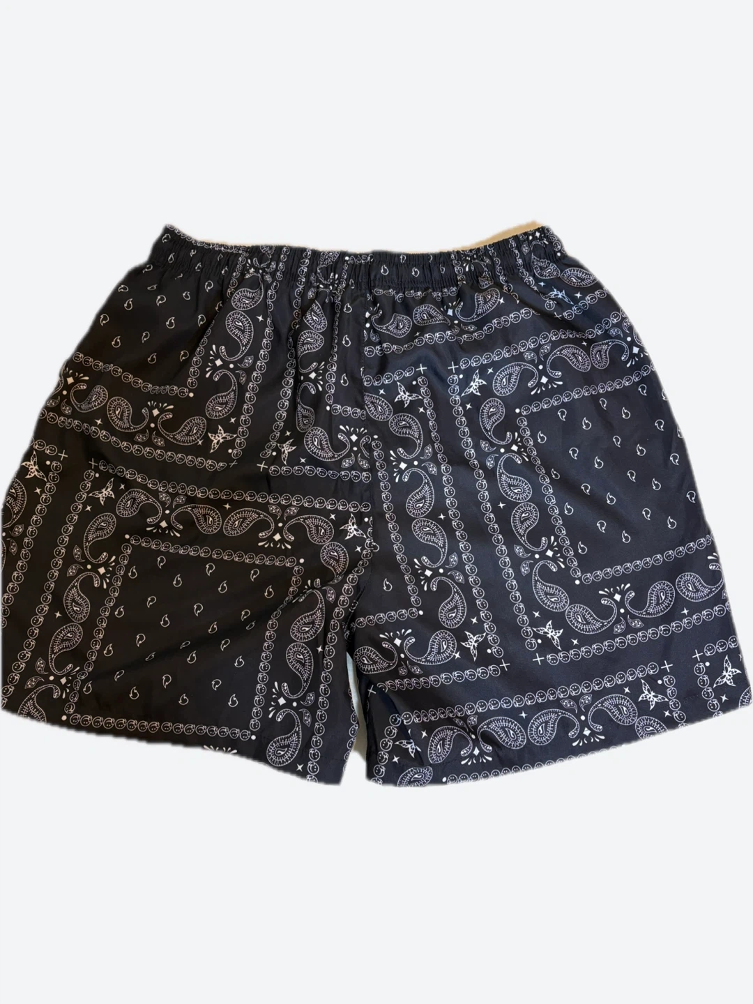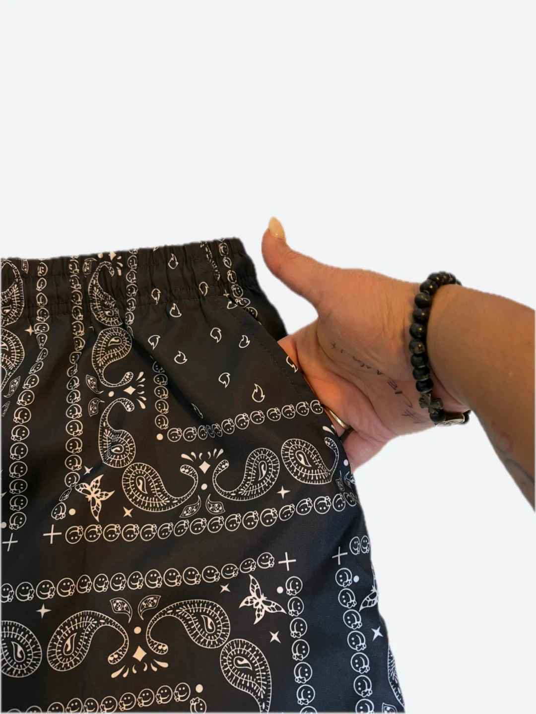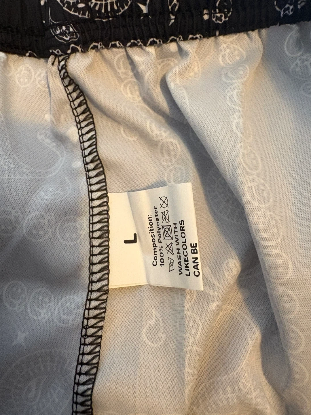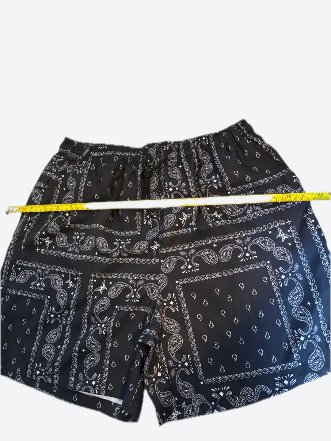 These shorts feature a cool bandana print design! They are size L and made of 100% polyester. The shorts have an elastic waistband and pockets, perfect for casual wear