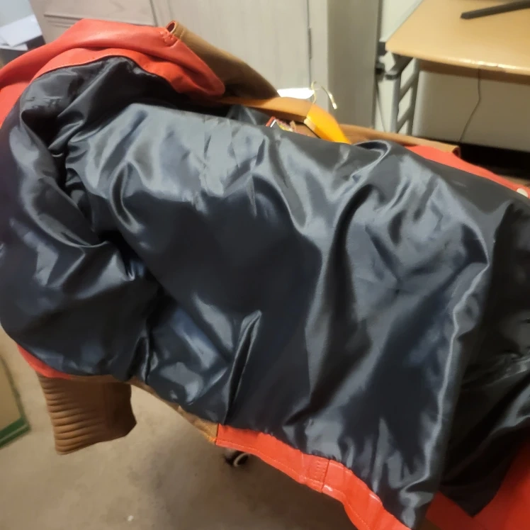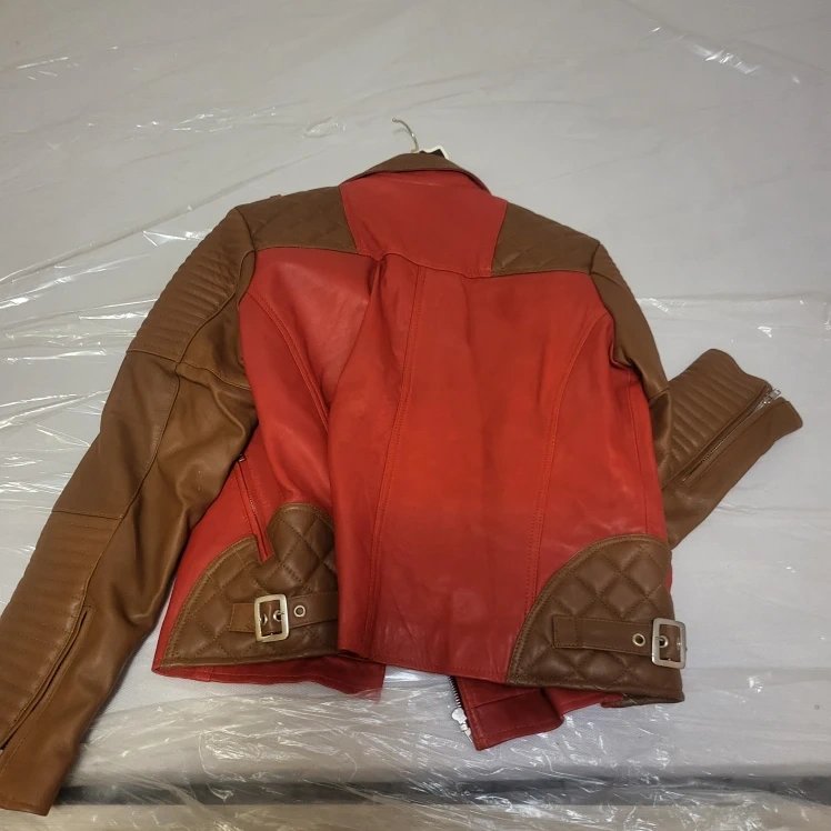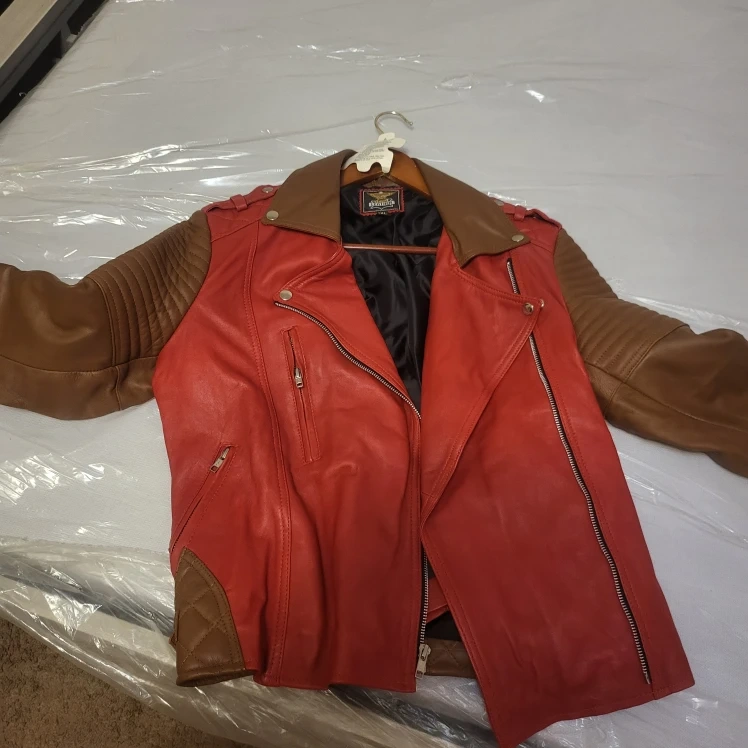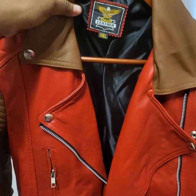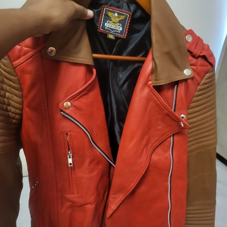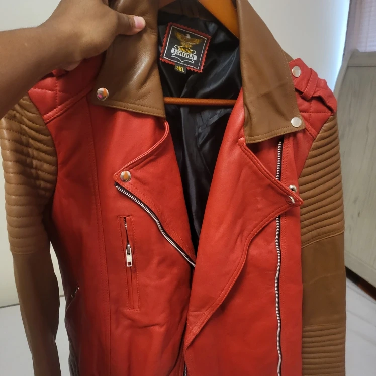 Here's a genuine leather jacket in a striking red and brown color combination! It's a size 3XL. But runs small The jacket features a classic biker style with quilted shoulder and elbow details. The inner lining is black. It's a stylish and comfortable jacket for any occasion