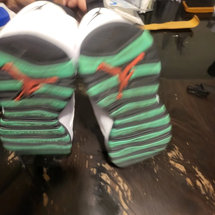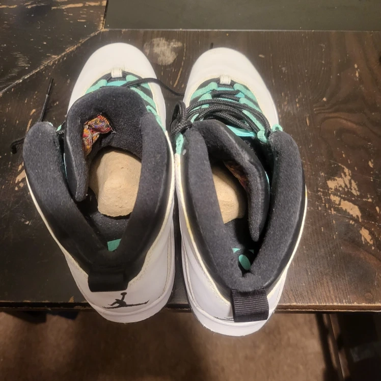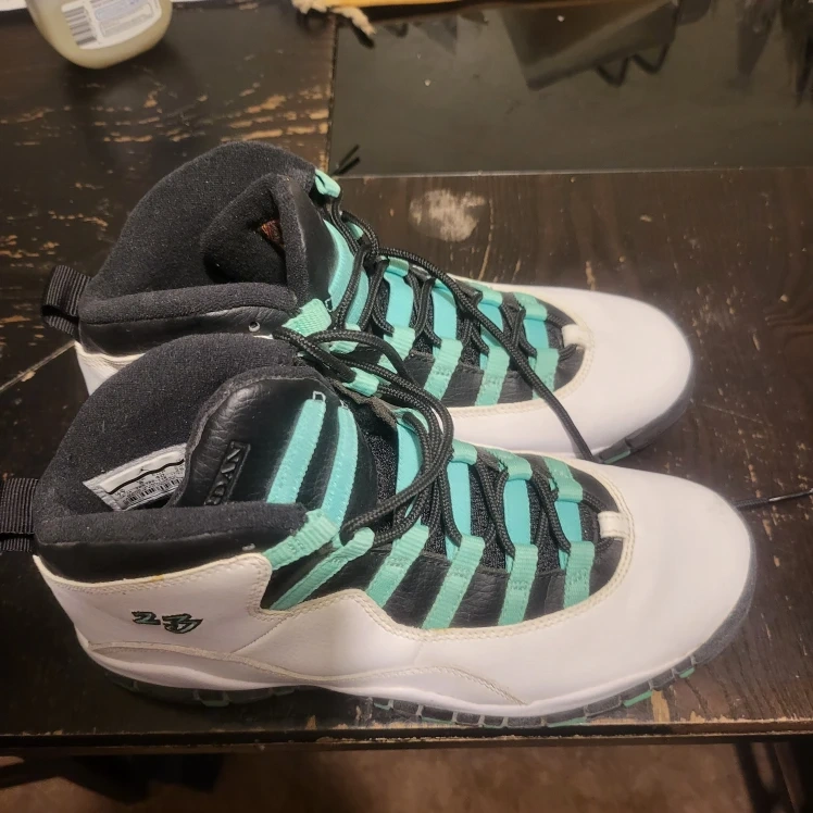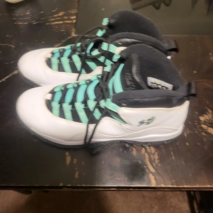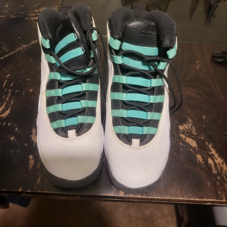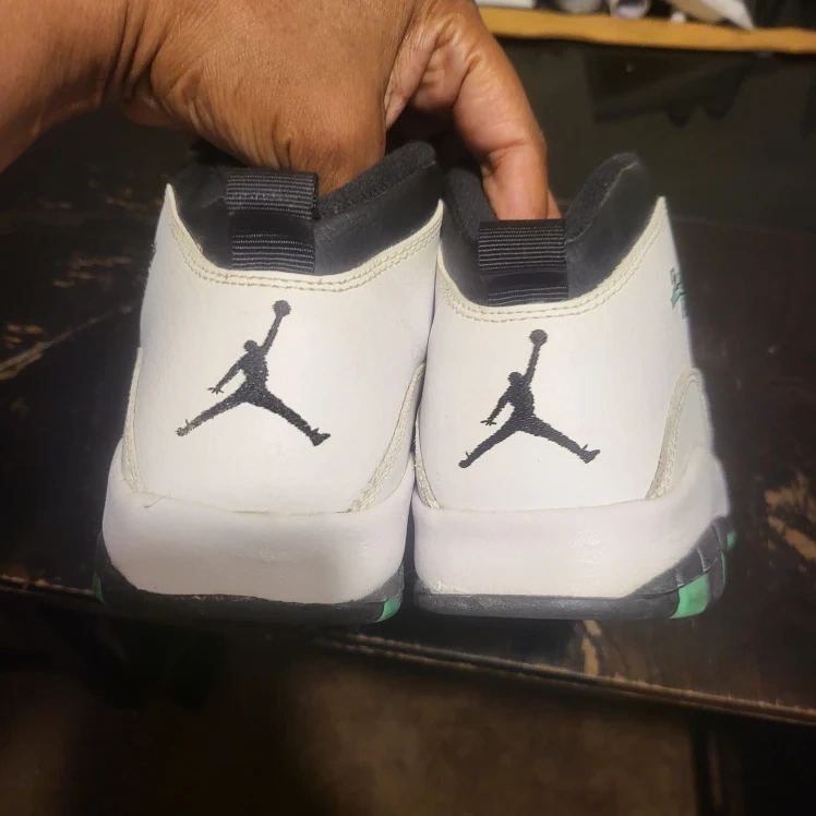 Selling a pair of Air Jordan 10 Retro sneakers in a white, black, and light verde colorway. These shoes feature the iconic Jumpman logo on the back and a unique lacing system. They are in good condition and ready for a new owner!