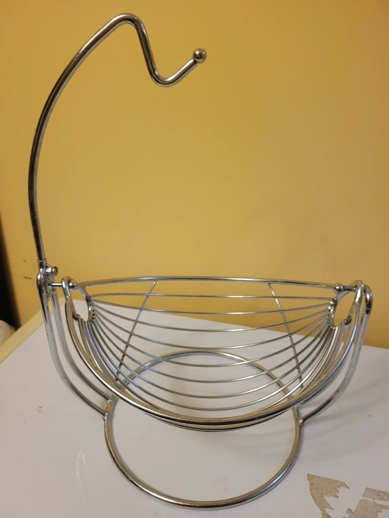 Here's a chrome fruit basket with a handy banana hanger! Perfect for keeping your fruit organized and looking stylish on your countertop. It's in great shape and ready for a new home to display your favourite fruits
