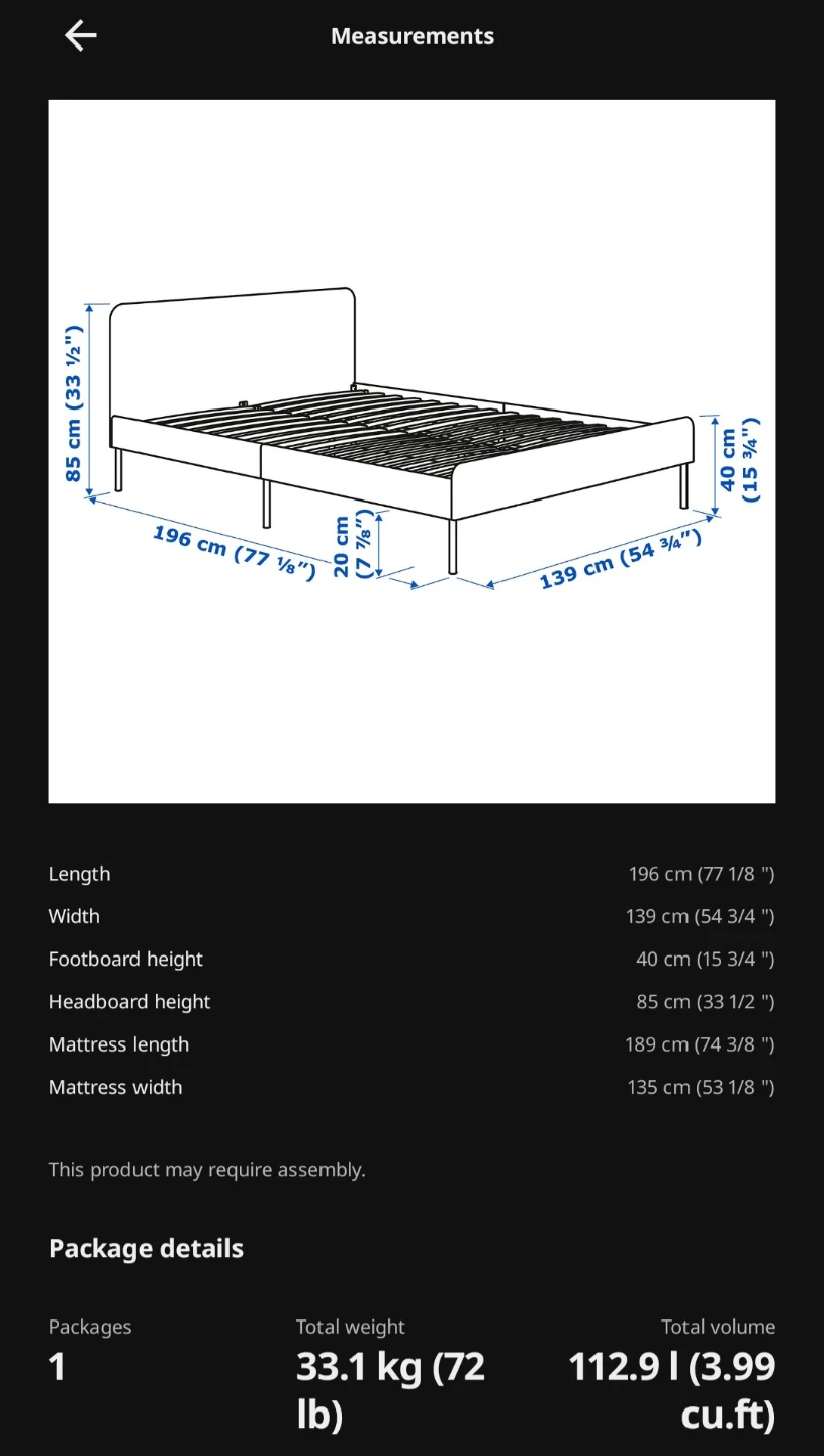 Selling an IKEA SLATTUM upholstered bed frame in Vissle dark grey. It's a full-size bed frame and in great condition. The dimensions are 196 cm (77 1/8 ") in length and 139 cm (54 3/4 ") in width. Originally bought for $159. Comes with the LURÖY slatted bed base.
