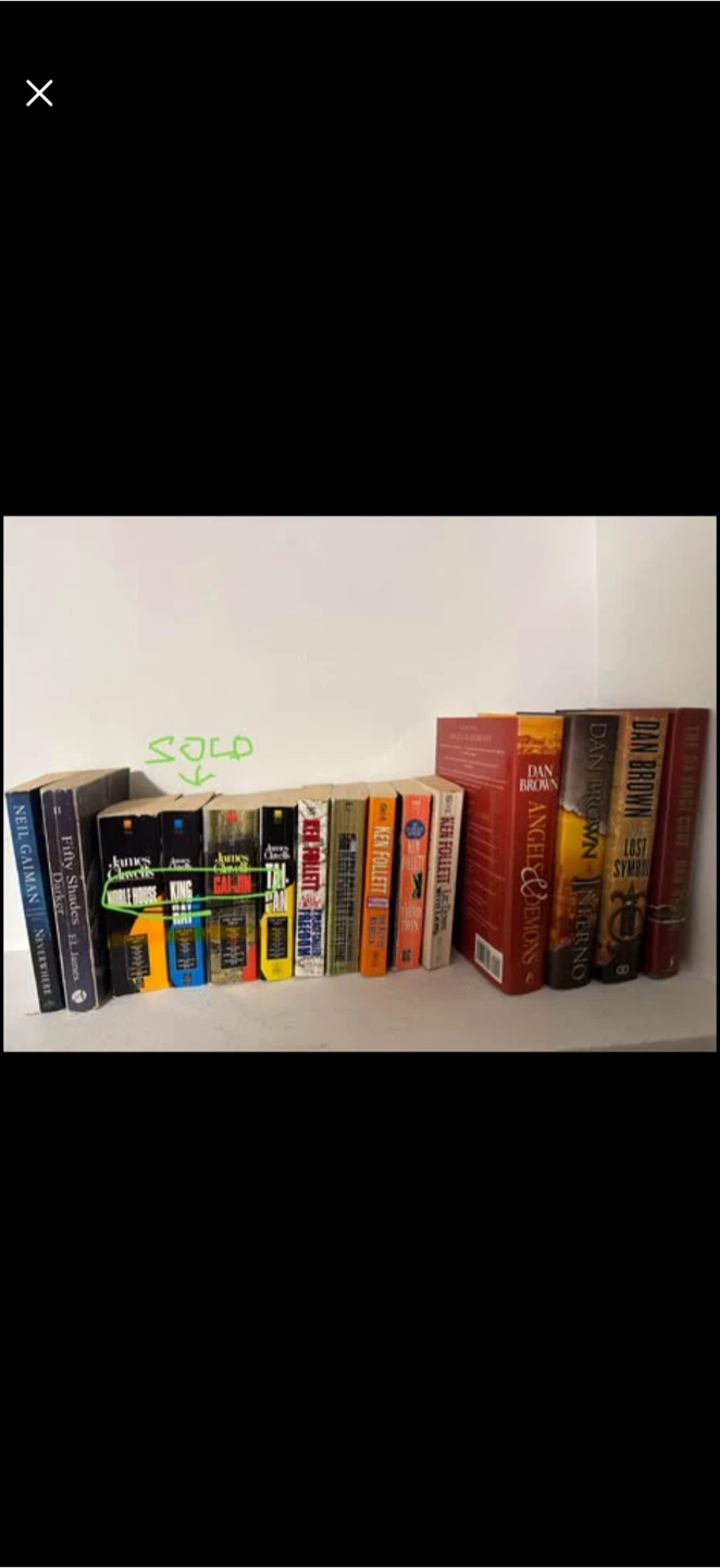 I'm selling a selection of books by various authors including Neil Gaiman (Neverwhere), Dan Brown (The Da Vinci Code, The Lost Symbol, Inferno, Angels & Demons), and Ken Follett (Freedom, A Dangerous Place, The Key to Rebecca, Lie Down with Lions, The Third Twin)