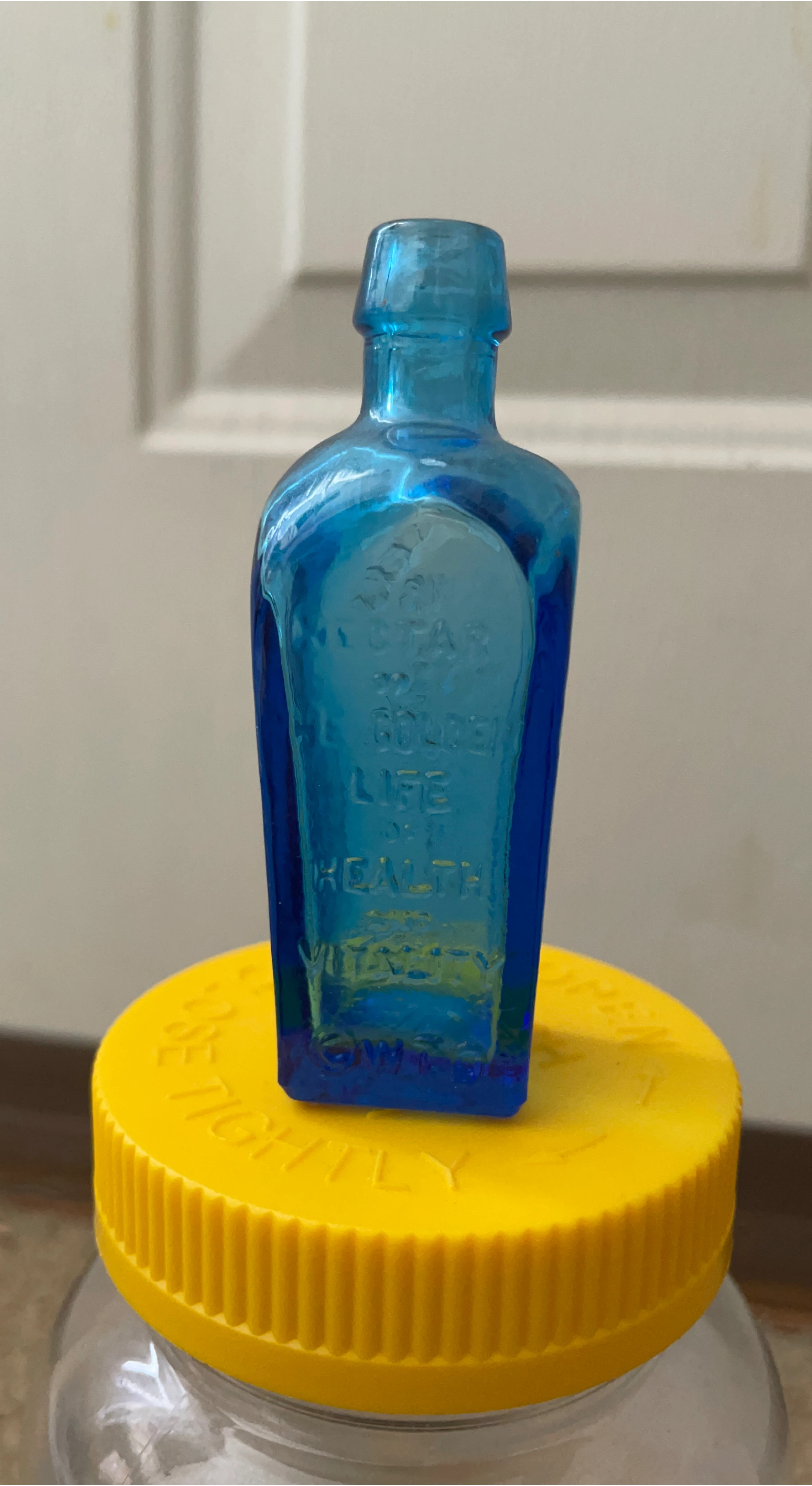 Selling a vintage blue glass bottle labeled 'Star of Golden Life Health Vitamins'. It's a unique piece for collectors or anyone interested in vintage health items