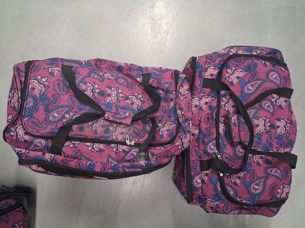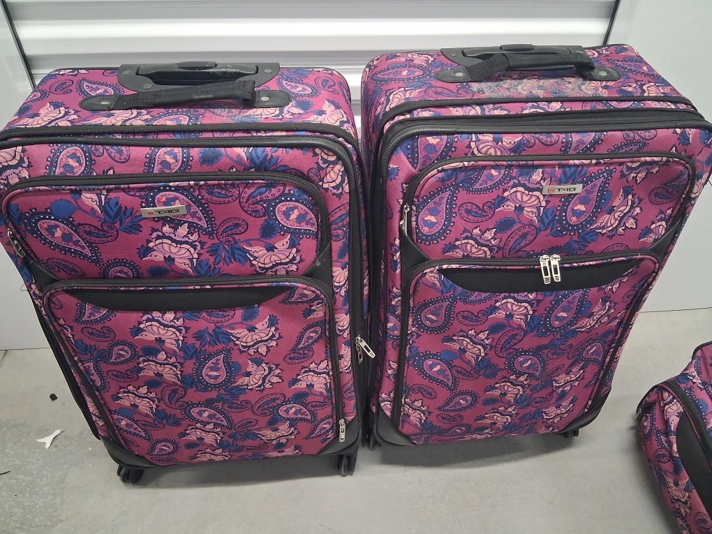 Selling a TAG Springfield Paisley 5-piece luggage set. This set includes various sizes of rolling suitcases and a duffel bag, all with a distinctive paisley pattern. Perfect for all your travel needs!