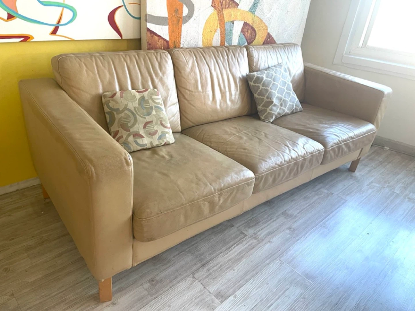 Selling a comfortable tan leather three-seat sofa. It's in good condition and perfect for a living room or den. The sofa has a classic design and is made of durable leather, ensuring it will last for years to come. It comes with two decorative pillows to add a touch of style to your space. This sofa is a great addition to any home!