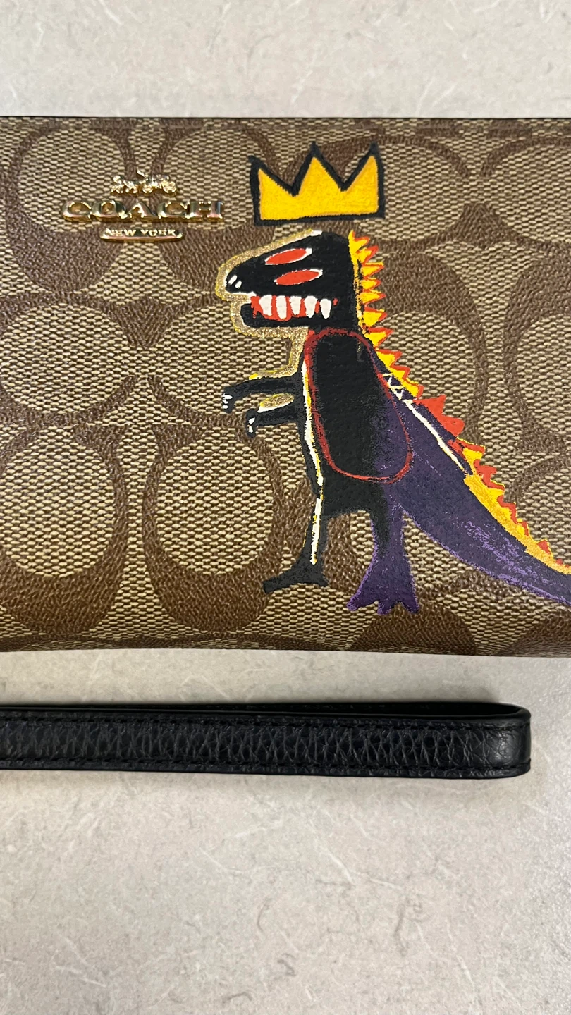 Coach Basquiat wallet Limited Edition, featuring a unique design. This stylish wallet is perfect for keeping your essentials organized with a touch of artistic flair, showcasing the iconic Basquiat dinosaur motif. The wallet is in excellent used condition. Price is Firm