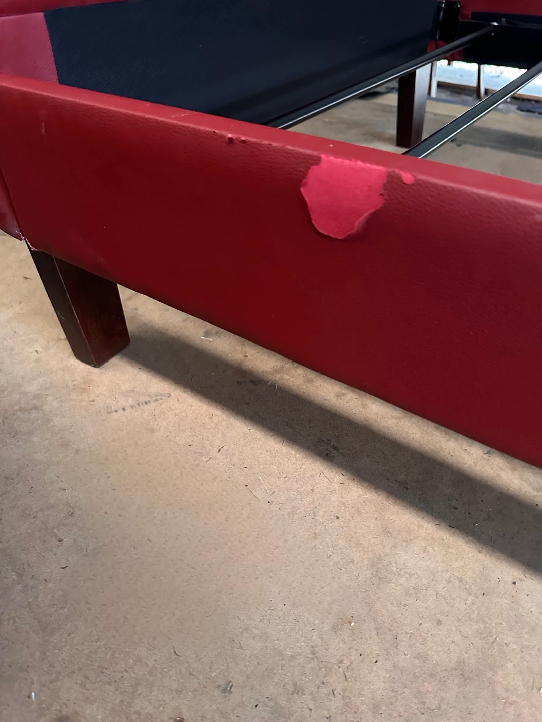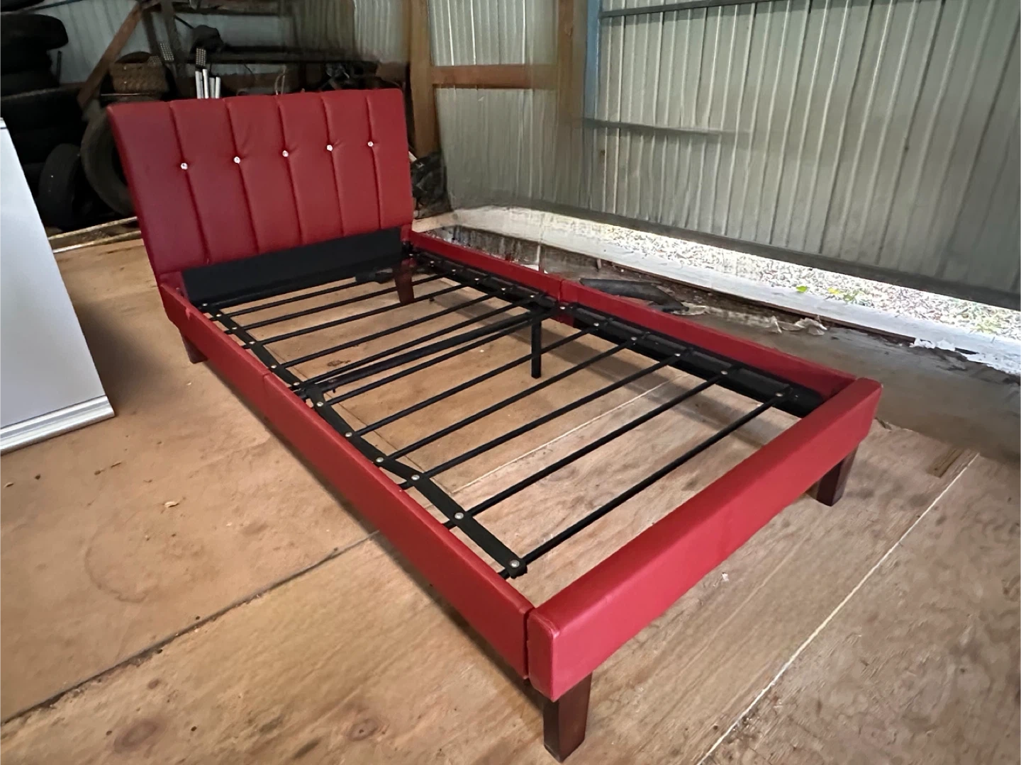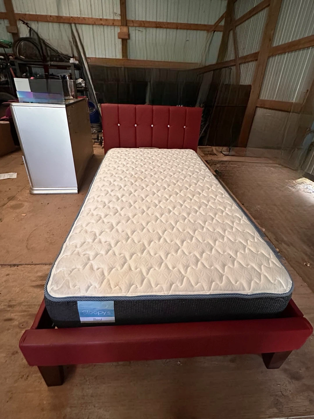 Selling a twin bed frame with a mattress. The bed frame is red and shows some wear and tear. The mattress is Sleepys brand.