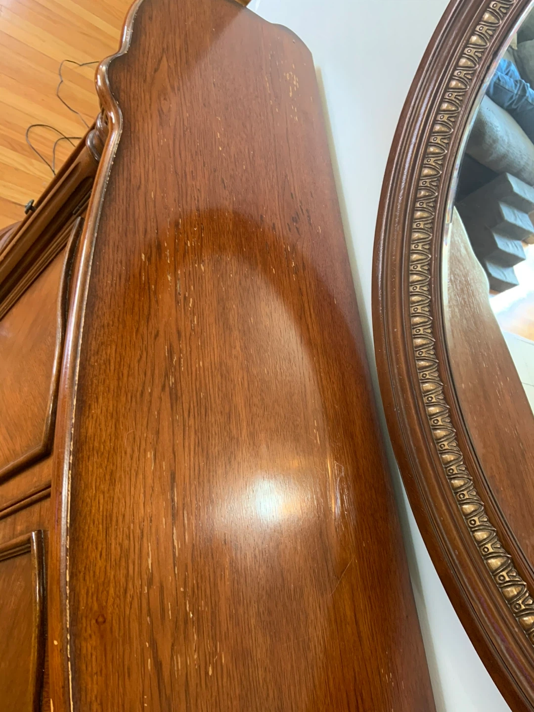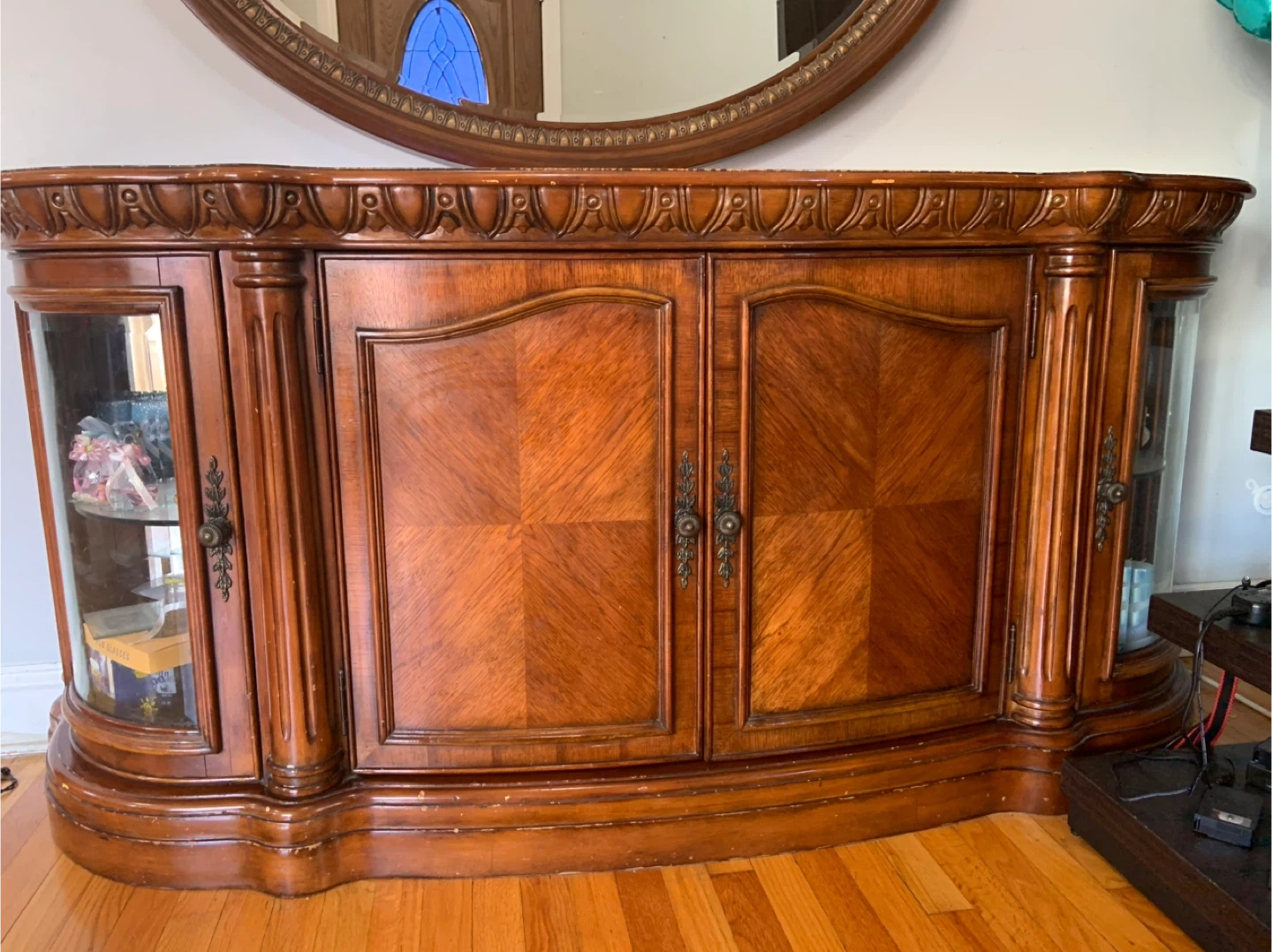 Here's a lovely vintage wooden buffet with a matching mirror! It's a beautiful piece of furniture with lots of character. The buffet has glass-fronted cabinets on either side, perfect for displaying your favorite items. The mirror is oval-shaped and complements the buffet nicely. It would look great in a dining room or living room