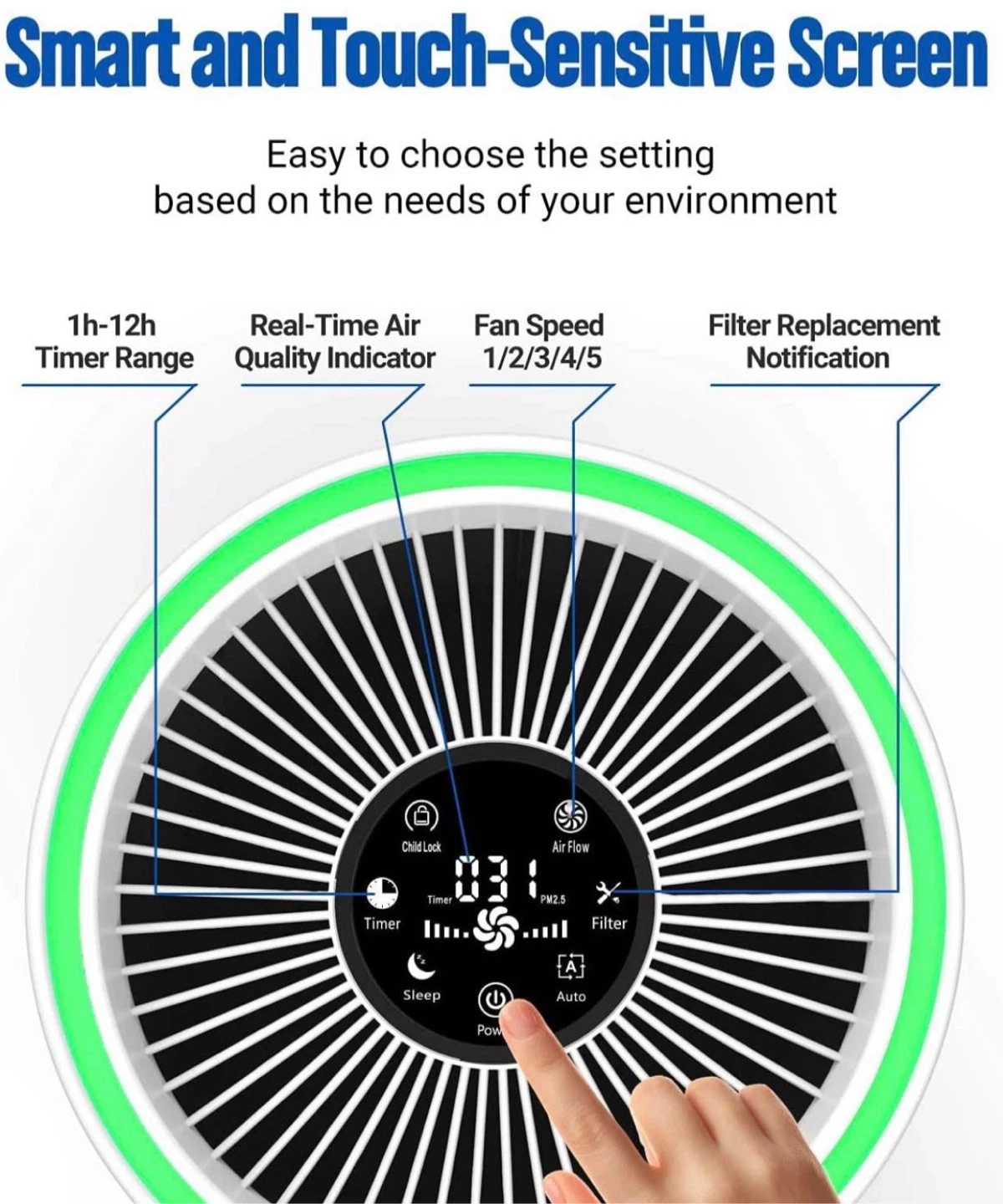SMART & AUTOMATIC-- Air purifier comes with build-in smart Air Quality Sensor,that runs and detects surrounding air quality instantly, and displays changes in color-coded air quality levels such as Green (Good), Blue (Moderate), Red (Poor). Gives you a real-time view of air quality.In "Auto Mode", it can automatically adjust between 5 fan speed settings in response to real-time air quality readings.30 Watts on High speed.It’s a good choice for saving energy.