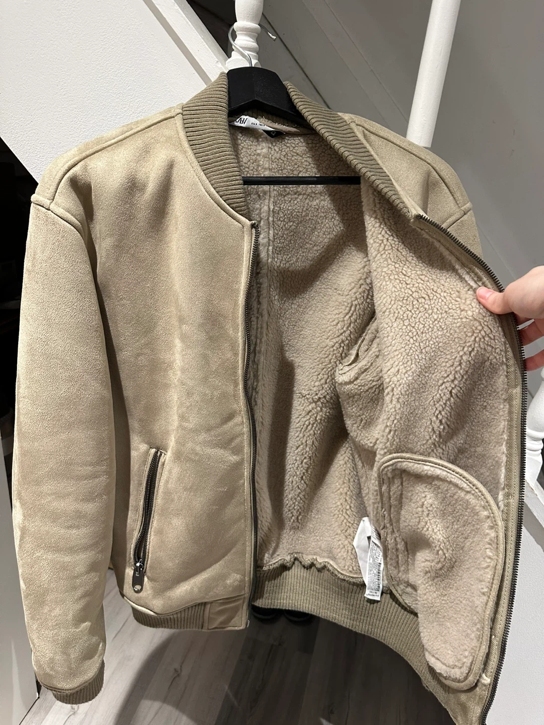 Selling a Zara suede bomber jacket in size small. The jacket features a soft suede exterior and a cozy interior lining. It's in great condition.