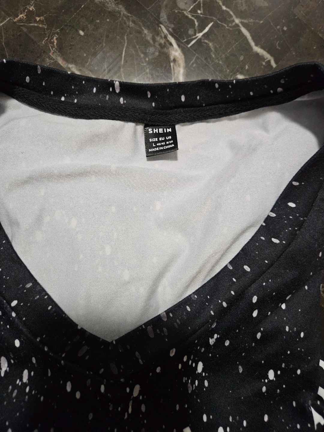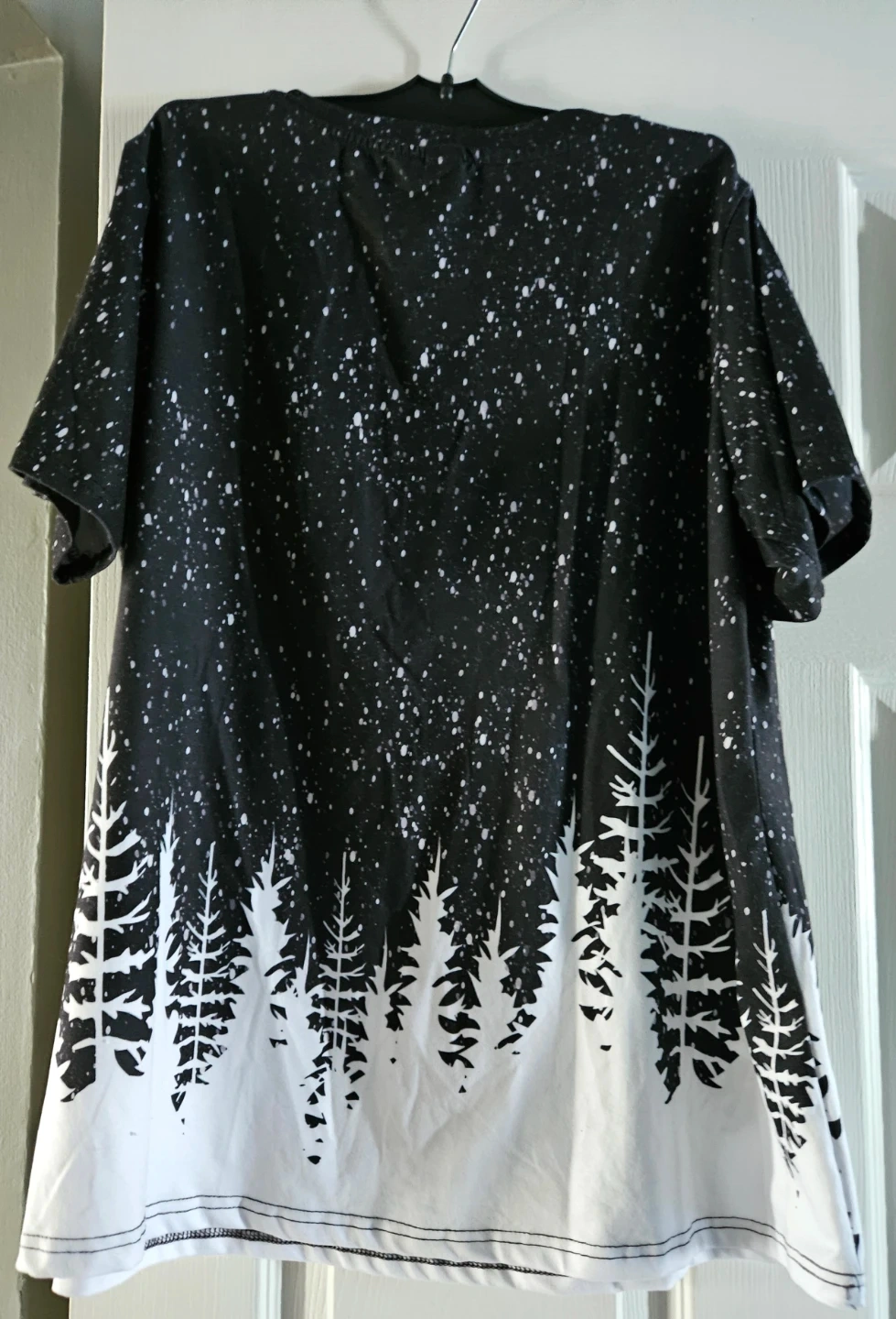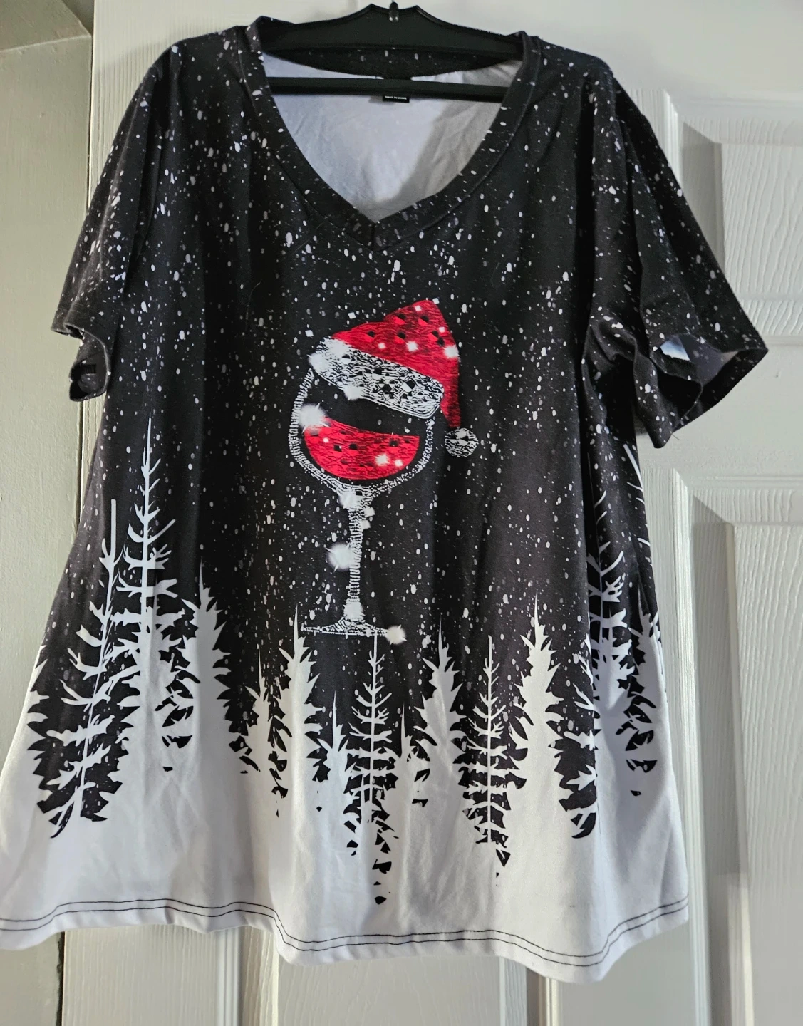 Here's a Shein shirt with a fun Christmas tree and wine glass design! It's made of 100% polyester and features a V-neck. The shirt has a black and white colour scheme that's sure to stand out. Relaxed fit. Pick up east mountain. Cash please.