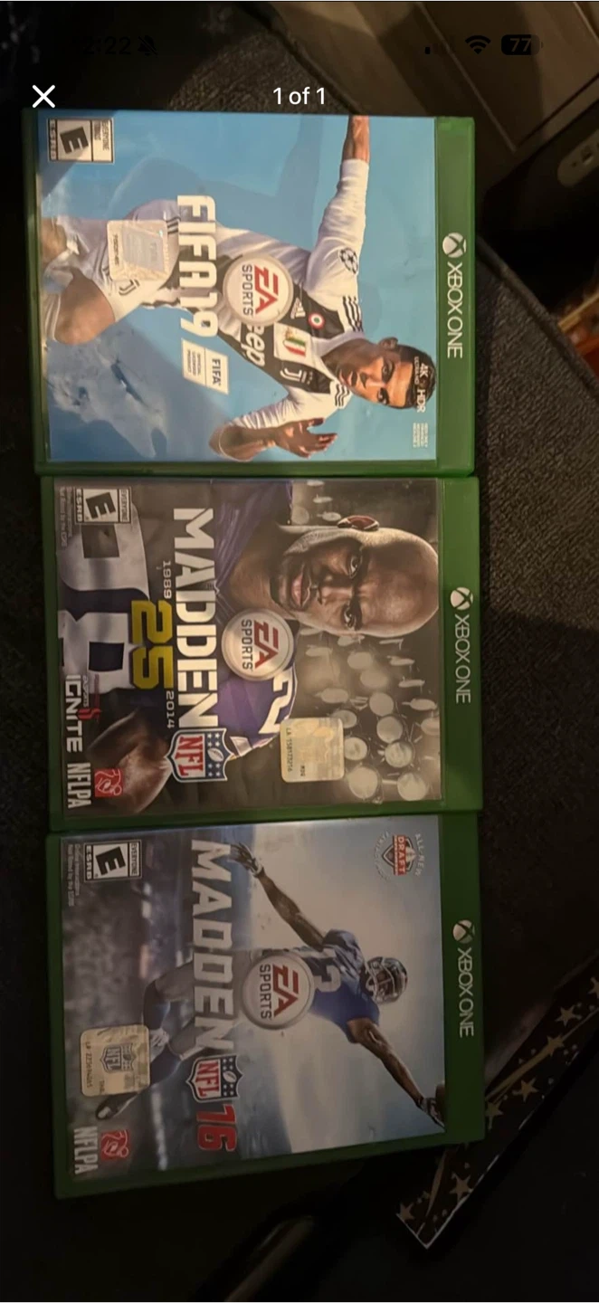 Buy & SellXbox One: FIFA 19, Madden 25, Madden 16Xbox One: FIFA 19, Madden 25, Madden 16$3Selling three Xbox One games: FIFA 19, Madden 25 (2014), and Madden 16EstadoNewWHERE TO MEETCheck LocationView MapSELLERAnthony lopezSouth Side120 reviews1 chats·0 favorites·26 viewsSEND CHAT TO SELLERHi Anthony lopez! I’m interested in your listing.Hi Anthony lopez! I’m interested in your listing.Get the Karrot app to chatSign In to chat