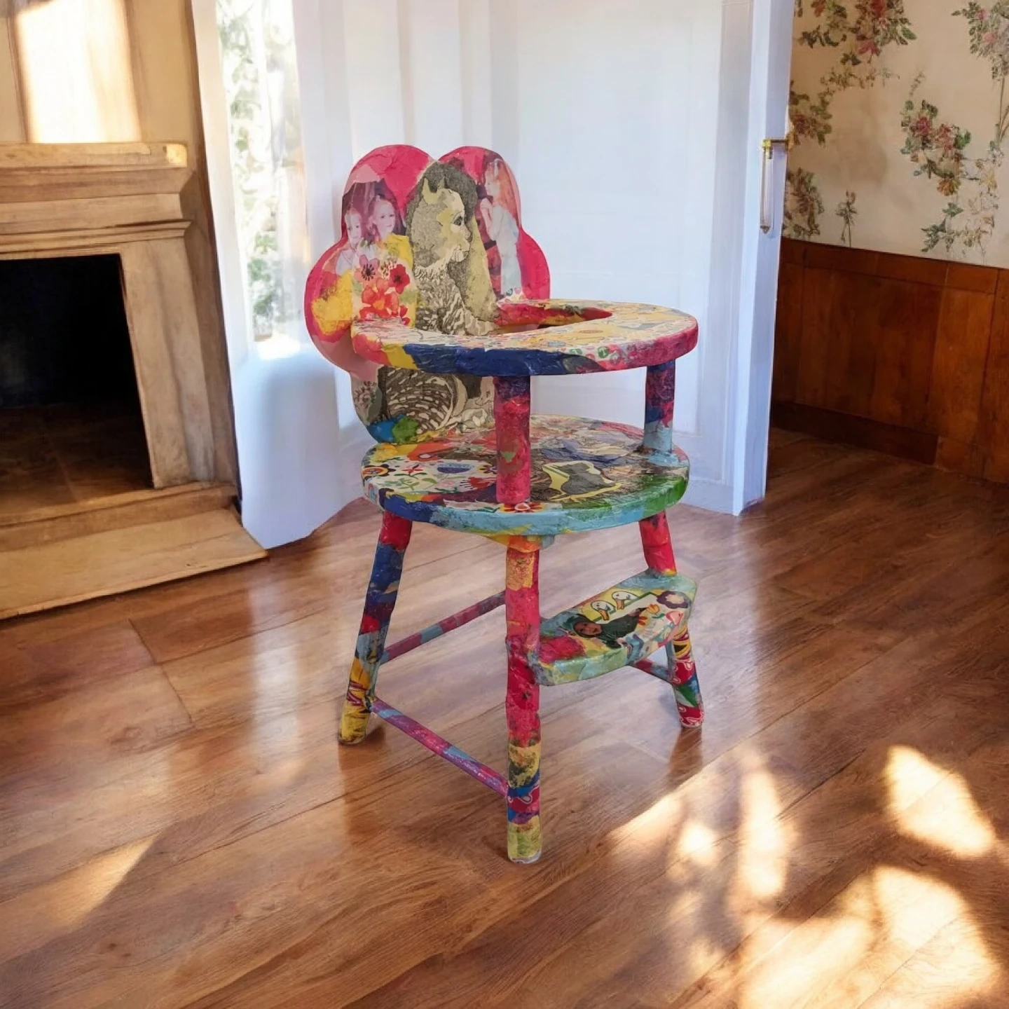 Handcrafted wood highchair. Signed original one of a kind art
