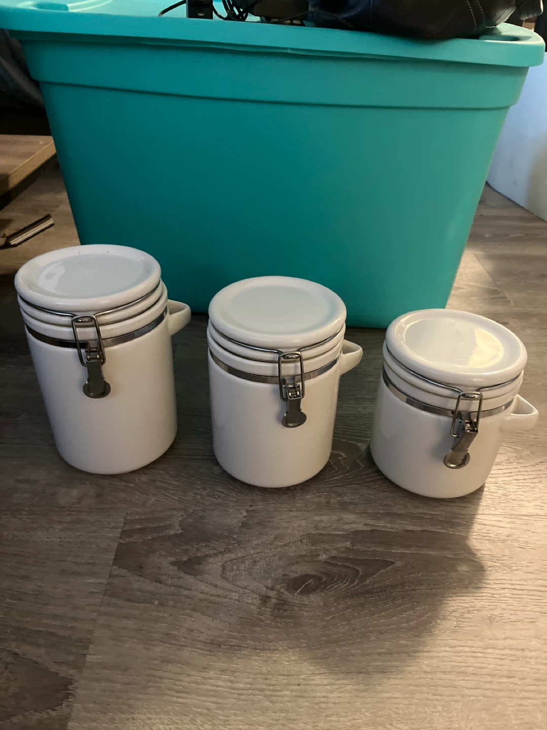 Selling a set of three white ceramic canisters. They have a nice, clean look and would be great for storing kitchen staples or other items around the house! They have metal clasps to keep them sealed.