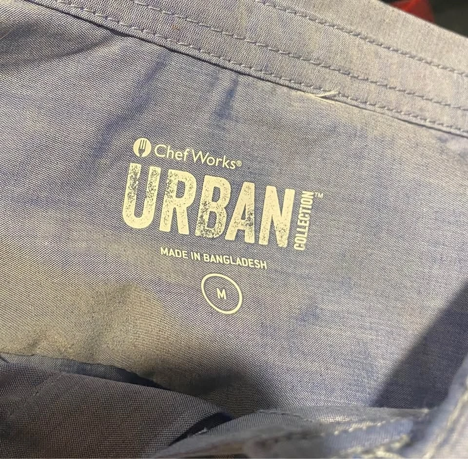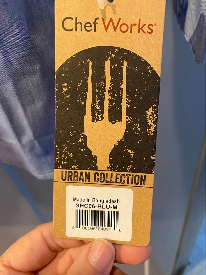 Chef Works brand Mens Chambray blue Dress Shirt roll-up long sleeves with button tab